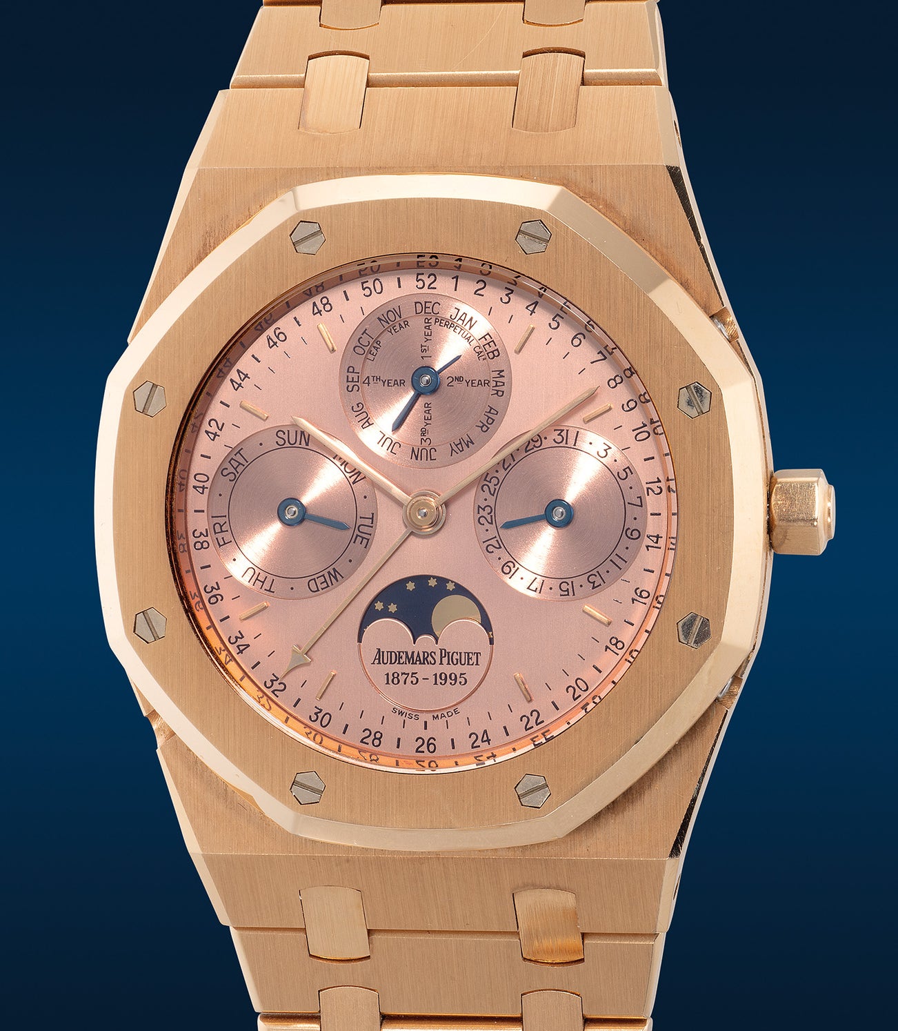 愛彼,「Royal Oak Quantieme Perpetuel Automatique」型號25810OR,十分罕有,限量版玫瑰金自動萬年曆鏈帶腕錶,備閏年、月相、星期顯示,為紀念愛彼成立120周年限量發行120枚,約1995年製。附原裝證書 、錶盒、調整筆