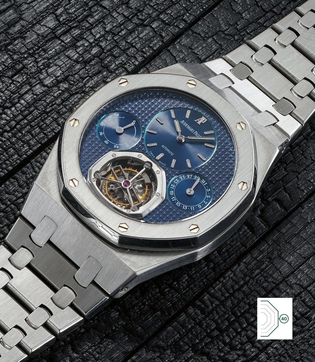 愛彼,極為罕有,精鋼陀飛輪腕錶,備藍色錶盤,限量發行25枚,編號第1號,1997年製。附原裝保證書