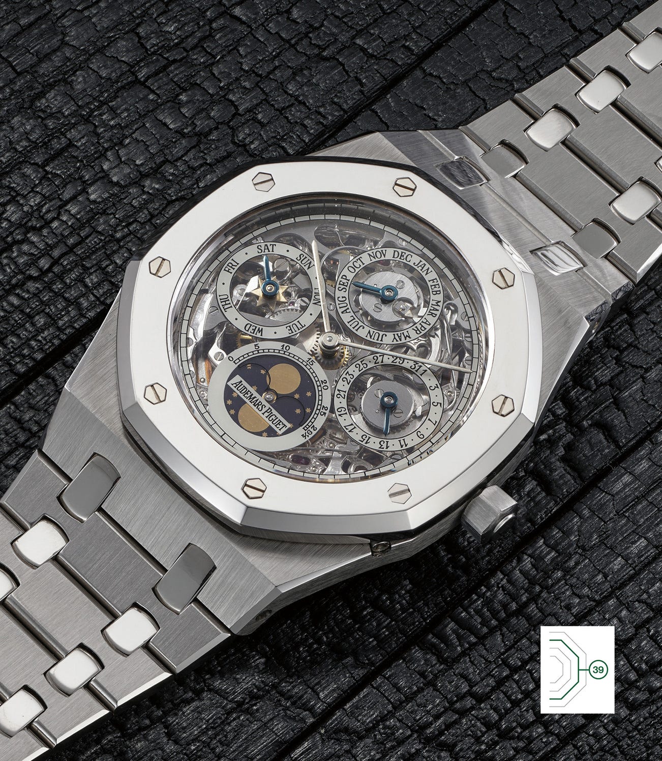 愛彼,非常罕有,限量版精鋼及鉑金萬年曆鏈帶腕錶,備鏤空錶盤,限量發行25枚,編號第16號,1994年製。