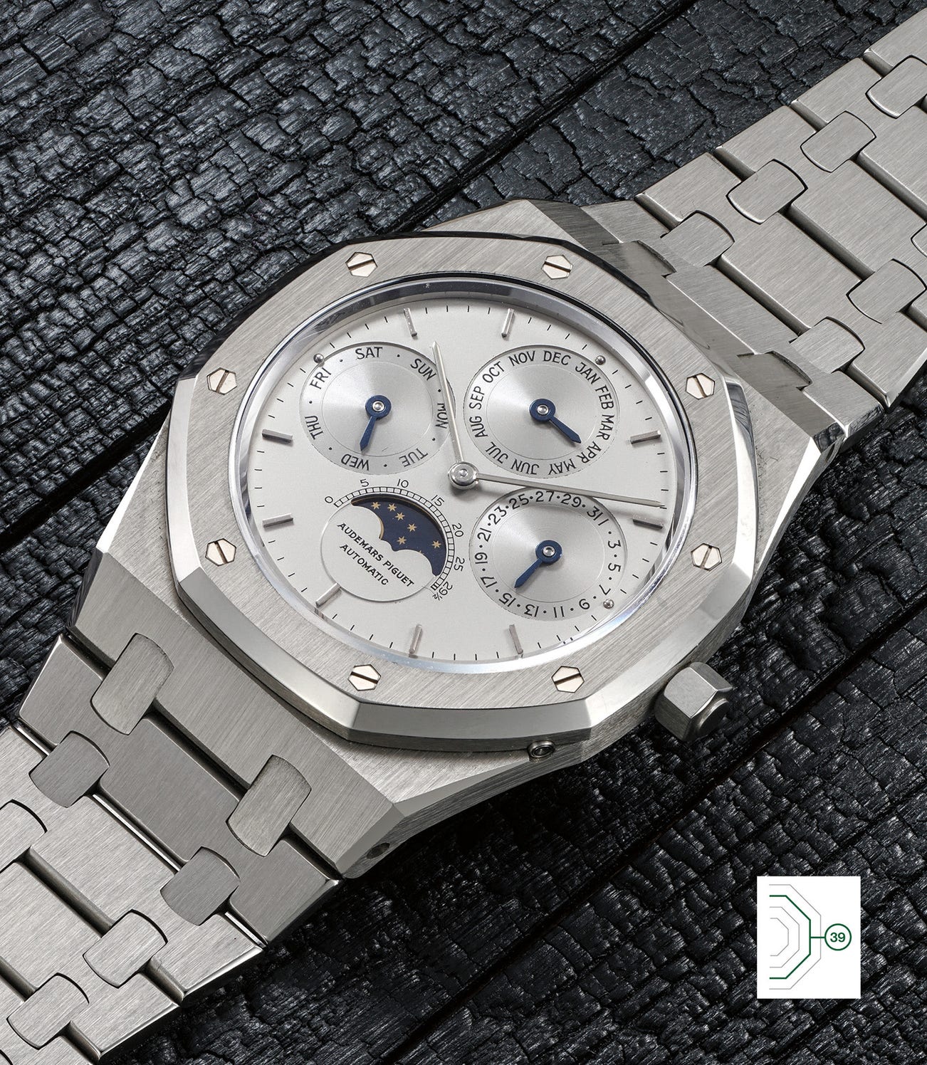愛彼,極為罕有、早期、重要,精鋼萬年曆鏈帶腕錶,備月相顯示、「MK I」錶盤、4位數字參考、「Triple Serial」錶蓋,1985年製。