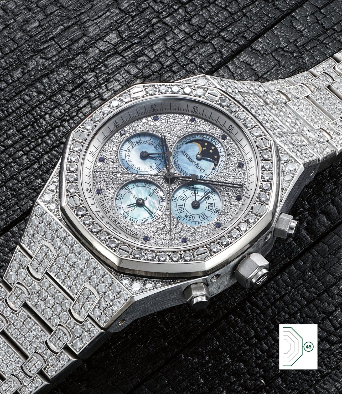 Gem-set Royal Oak pieces - especially dating to more than a few years ago - are enormously scarce, both due to the cost of the objects, but also to the fact that gem-setting on a sports watch is a conflictual combination as the ethos of the watch calls for more robust and technical materials (steel above all). On the technical side, while the term “Grande Complication” is wildly abused these days for marketing purposes, it has a semi-official definition - hardly ever respected, with the present watch being the exception to the rule: a watch defined as a “true” Grande Complication timepiece should incorporate a timing complication, a calendar complication and a chiming complication. Only a handful of wristwatch models respect these requirements. The present timepiece in fact not only respects them, but even exceeds them: it does feature a minute repeater, a perpetual calendar and a chronograph but as if this was not enough, the ante is upped by the fact that this is no mere chronograph, but a split-second variation.