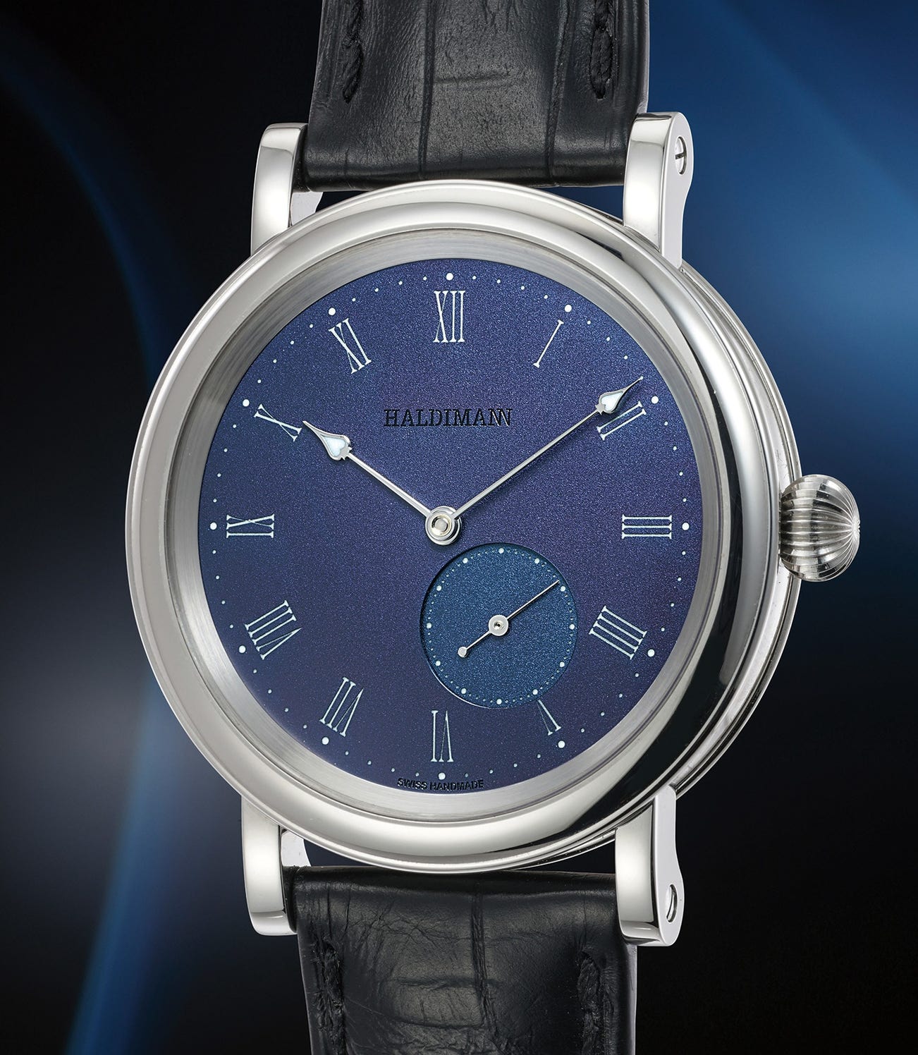 In 2013 Haldimann took his no frills design philosophy to a new level by launching two pieces indicating hours and minutes (H11) and hours, minutes and offset seconds (H12). The movements featured a surprising hand frosted full plate with only the balance and balance bridge originally placed at the centre visible as well as the crown wheel, ratchet wheel and click.