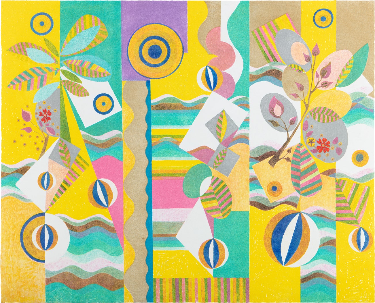 Brazilian | 1960Beatriz Milhazes is best known for her vibrantly colored yet calculated compositions. The artist has cited Baroque architecture, lace work, Carnival decoration and the flora of the Jardim Botanico in Rio de Janiero chief among her inspirations. Milhazes' artistic practice is akin to monotype or collage in that the artist first paints motifs directly onto transparent plastic sheets and later applies them to the canvas, leaving the plastic to dry. The superimposed image allows for overlapping and layering, resulting in a textured canvas and a distorted central focal point. While seemingly chaotic, Milhazes' compositions are perfectly balanced due to the artist's technically sophisticated use of geometric forms and chromatic color palate.