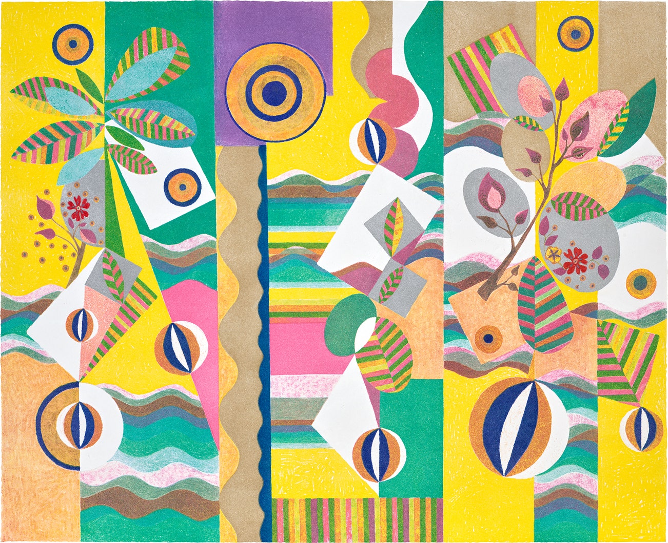 Brazilian | 1960Beatriz Milhazes is best known for her vibrantly colored yet calculated compositions. The artist has cited Baroque architecture, lace work, Carnival decoration and the flora of the Jardim Botanico in Rio de Janiero chief among her inspirations. Milhazes' artistic practice is akin to monotype or collage in that the artist first paints motifs directly onto transparent plastic sheets and later applies them to the canvas, leaving the plastic to dry. The superimposed image allows for overlapping and layering, resulting in a textured canvas and a distorted central focal point. While seemingly chaotic, Milhazes' compositions are perfectly balanced due to the artist's technically sophisticated use of geometric forms and chromatic color palate.