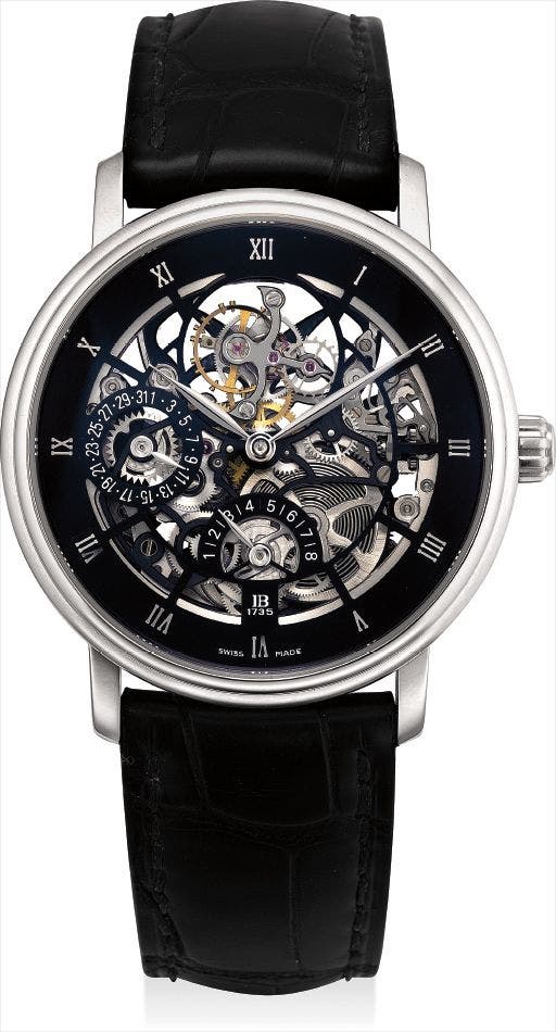 寶珀,精細及罕有,鉑金自動上弦鏤空腕錶,配陀飛輪、日曆顯示及動力儲存,“Villeret Tourbillon Squelette 8 Jours”,型號6025AS-3430-55,約2012年製