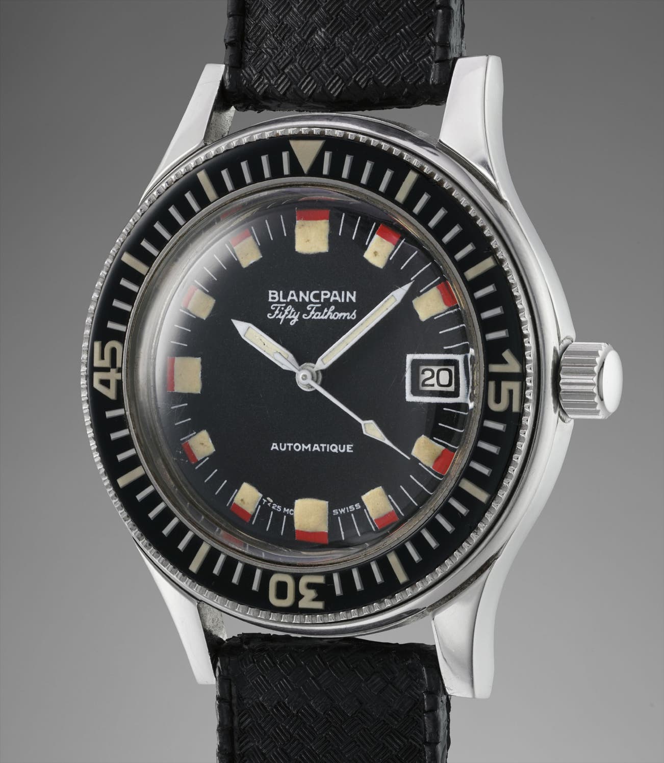 Since the release of Fifty Fathoms, Blancpain has released a variety of versions. While some were made for civilian use, others were issued to the military. The Barracuda model is distinguished by its two-tone numerals, which this model is best known for. It was originally issued to the American, German and Polish military.
