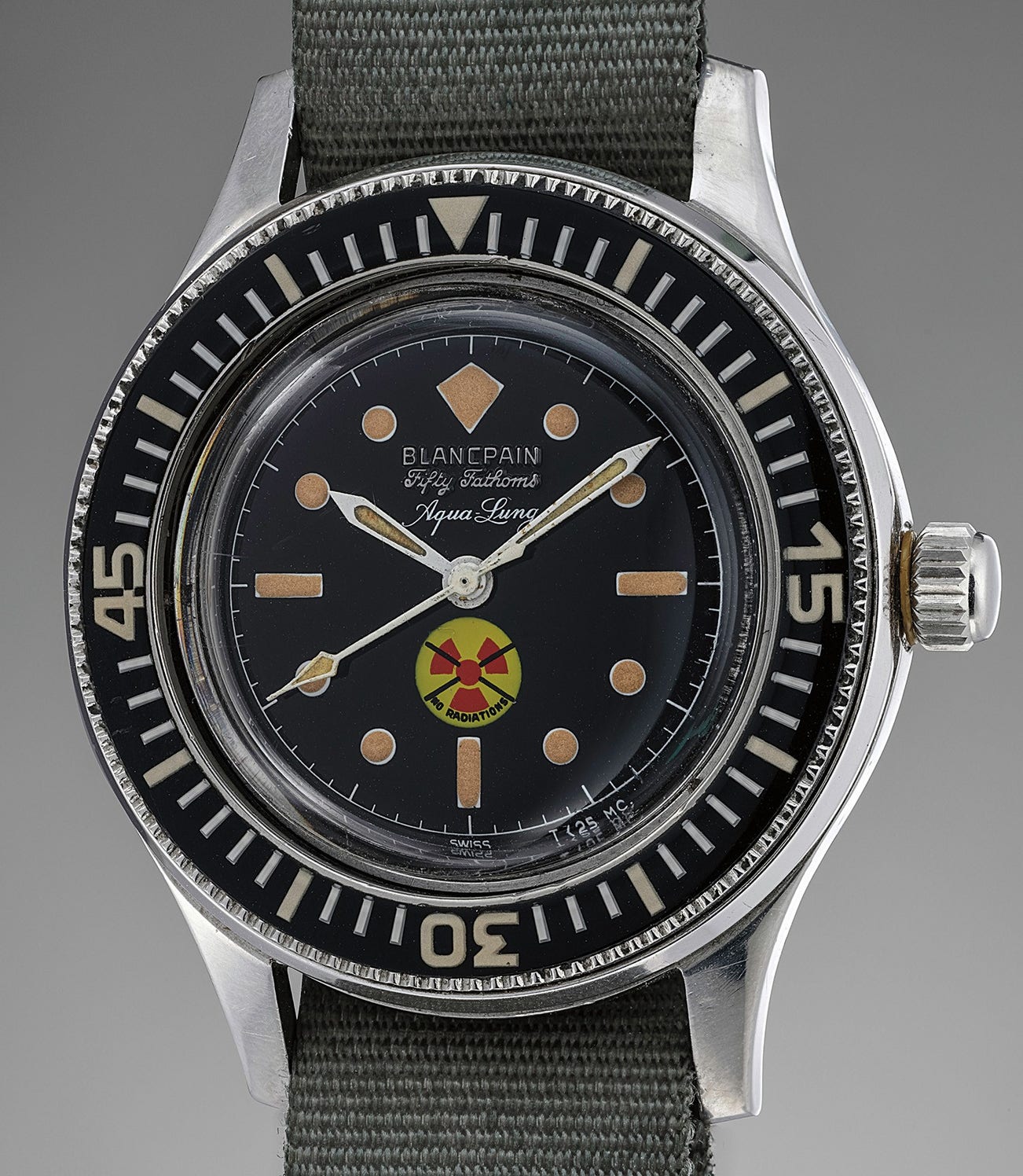 When the first military Fifty Fathoms came out, radium was the logical choice to insure the luminosity of the watch in the darkness of the sea. Later on, and with the rise of the public’s concern with the level of radioactivity of this material, Blancpain decided that civilian versions of the Fifty Fathoms should use tritium and would clearly indicate the harmlessness of their luminescent material. Civilian models therefore feature the universal symbol for radioactivity stroked through with the mention “No Radiations” at 6 o’clock on the dial.