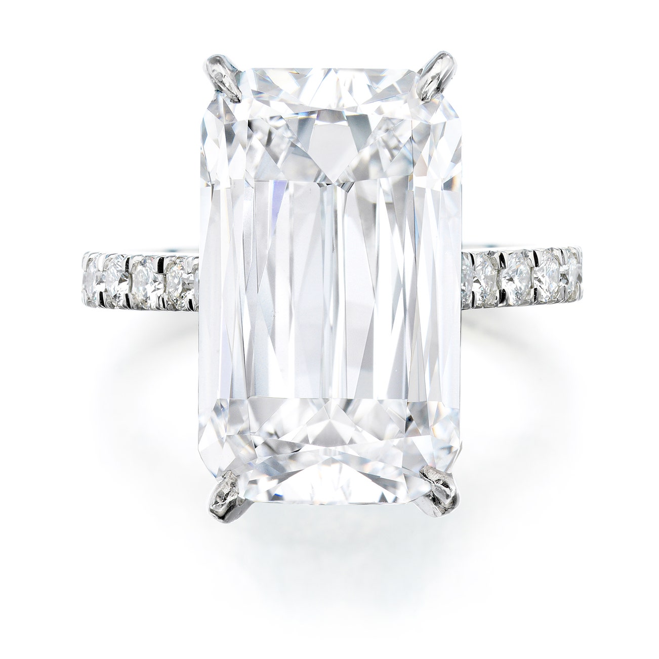 Set with a round-cornered rectangular modified brilliant-cut diamond weighing 8.00 carats, the mount enhanced with brilliant-cut diamonds, mounted in platinum, size 5, signed Boodles, British hallmarks for platinum, case stamped Boodles.