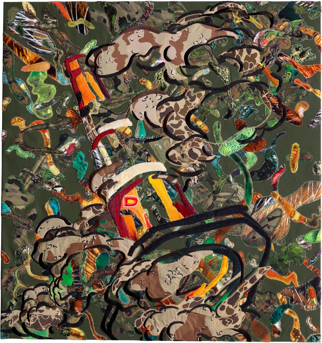 army jackets, beach towels, fabric and embroidery on canvas