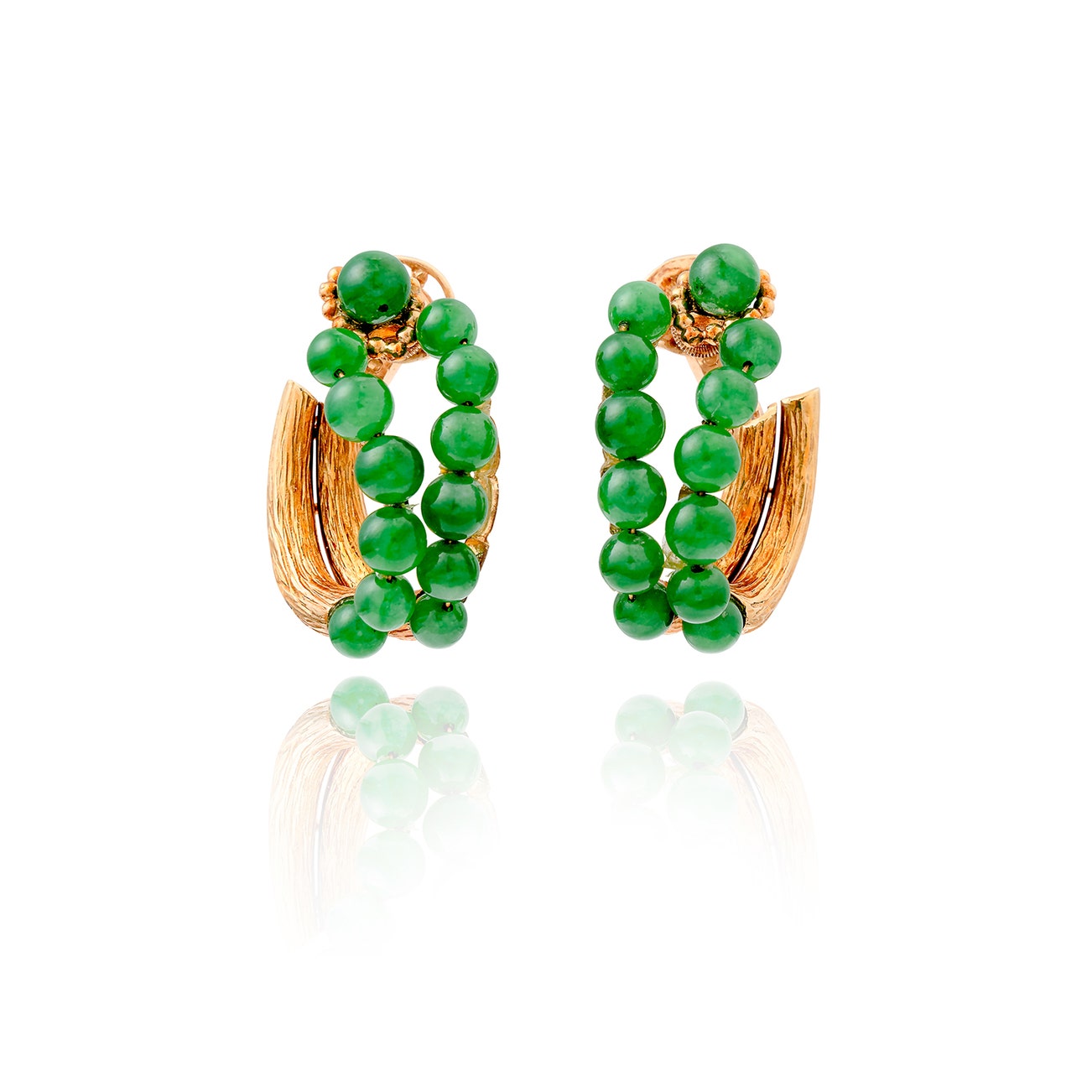 Each set with green chalcedony beads, length approximately 33mm, each signed Boucheron, French maker's mark and assay mark for gold, pouch stamped Boucheron.