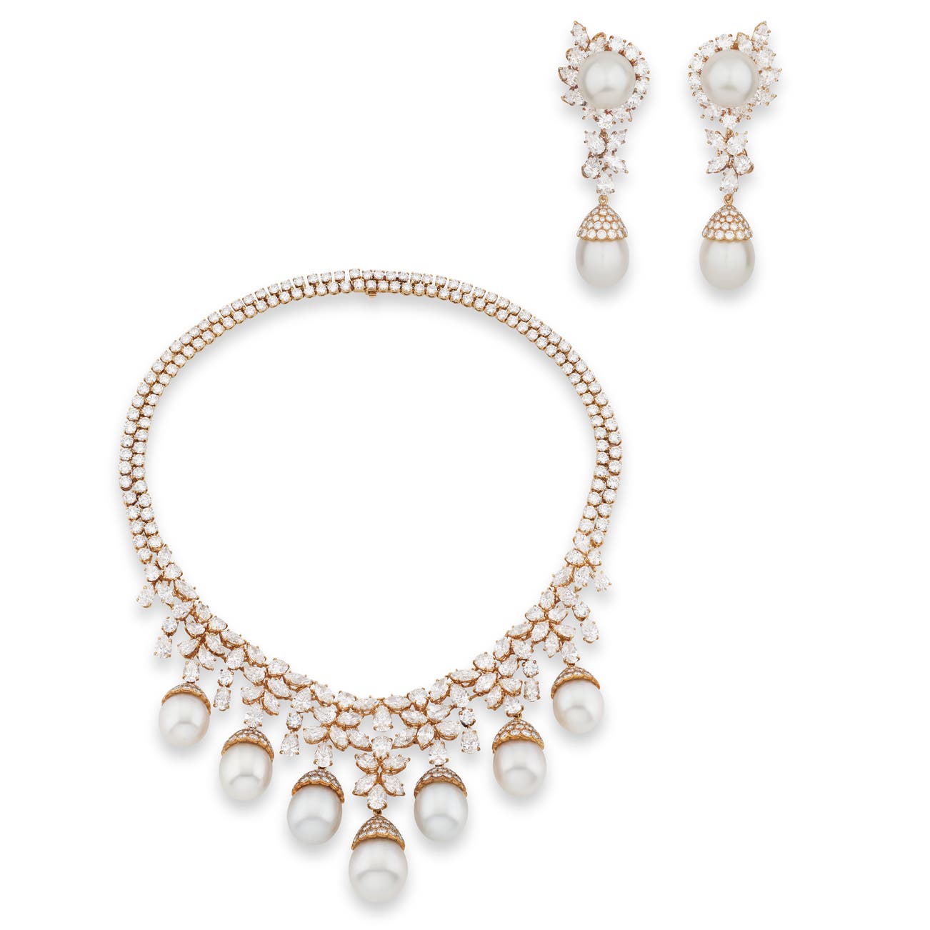 Comprising a necklace of fringe design, set with pear-, marquise-shaped and brilliant-cut diamonds, supporting drop shaped cultured pearls capped with brilliant-cut diamonds, length approximately 375mm; and a pair of ear clips, each measuring approximately 65 x 23.5mm, hinged back fittings, with detachable pendants, signed Boucheron, numbered, French maker's marks and assay marks for gold.