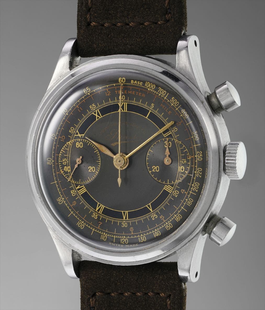 Moreover, the present watch is housed in a 38 millimeter case, which was extremely large for the period. It is interesting to note that the number "39" is engraved beneath the upper left lug, which corresponds to the last two digits of the case number. The gold and copper multi-scale dial is very attractive contrasting again the slate grey dial.