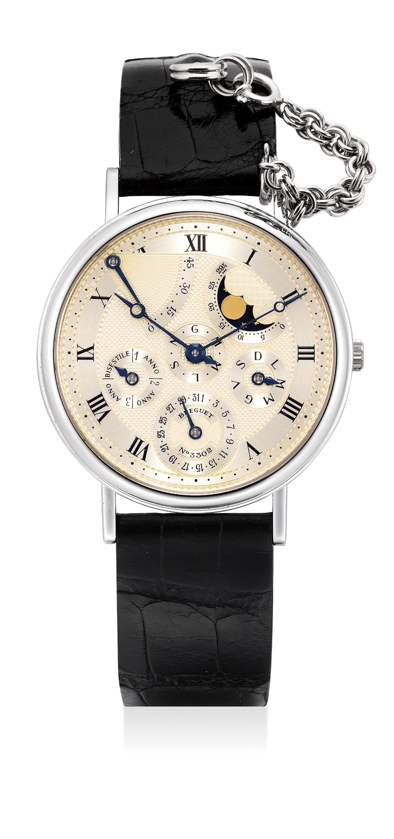 寶璣,「Classique Complications」型號,精細,18K白金自動上弦腕錶,配萬年曆、閏年、月相顯示和動力儲存, 約1995年製。附錶盒