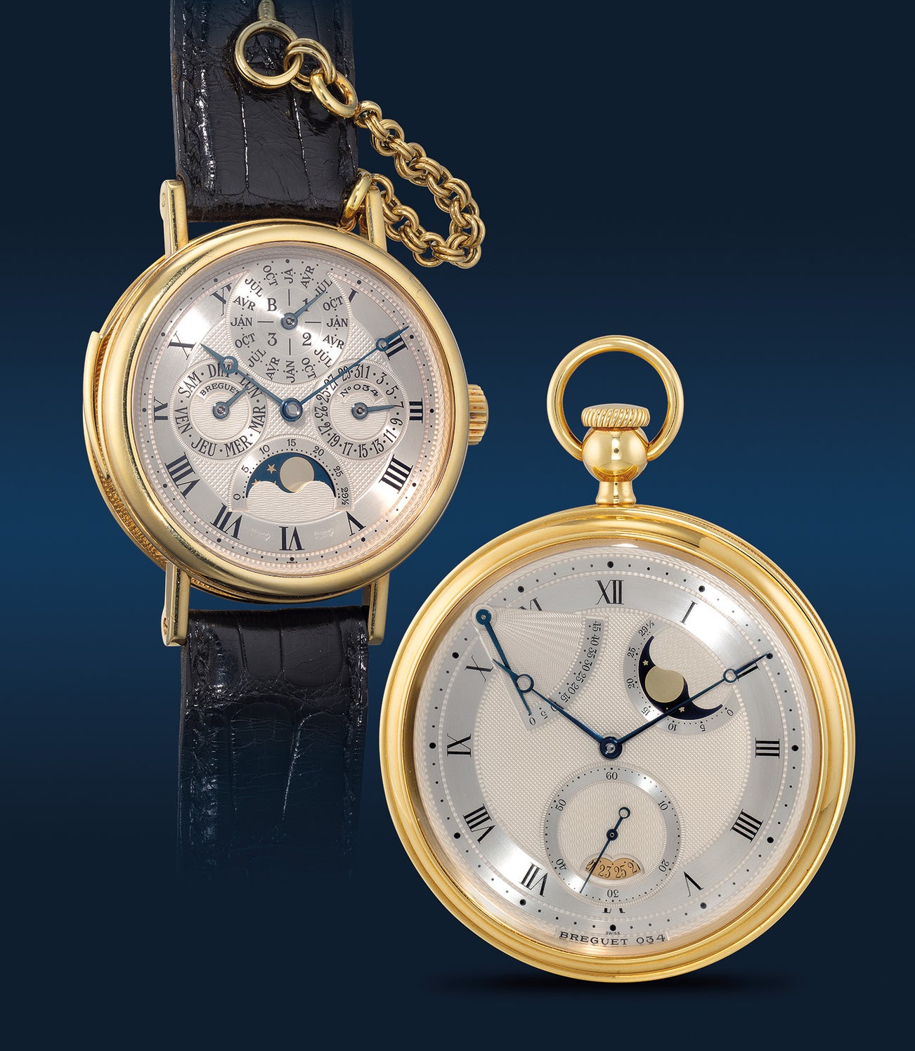 寶璣天文時計套裝,限量發行300枚套,編號34號,約1991年製。附原裝證書、錶盒 A)寶璣,型號3430,黃金三問萬年曆腕錶,備璣鏤錶盤、閏年、月相顯示 B) 寶璣,型號1890,黃金自動天文懷錶,備璣鏤錶盤、瞬跳日曆、月相、45小時動力儲存顯示