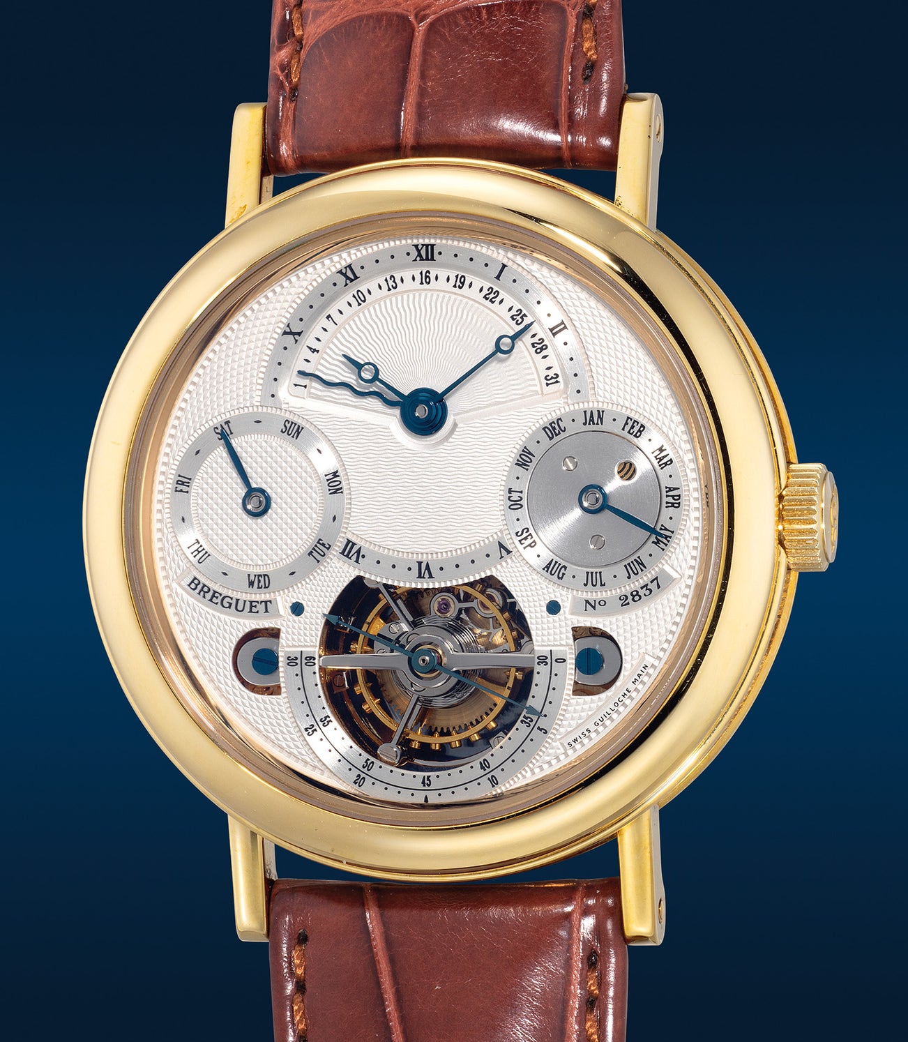 寶璣, 「Brevet Du 7 Messidor An 9」型號3757BA/1E/9V6,極度罕有精細,黃金萬年曆陀飛輪腕錶,備逆跳日期、閏年顯示,約2003年製。原裝證書、錶盒、調整筆