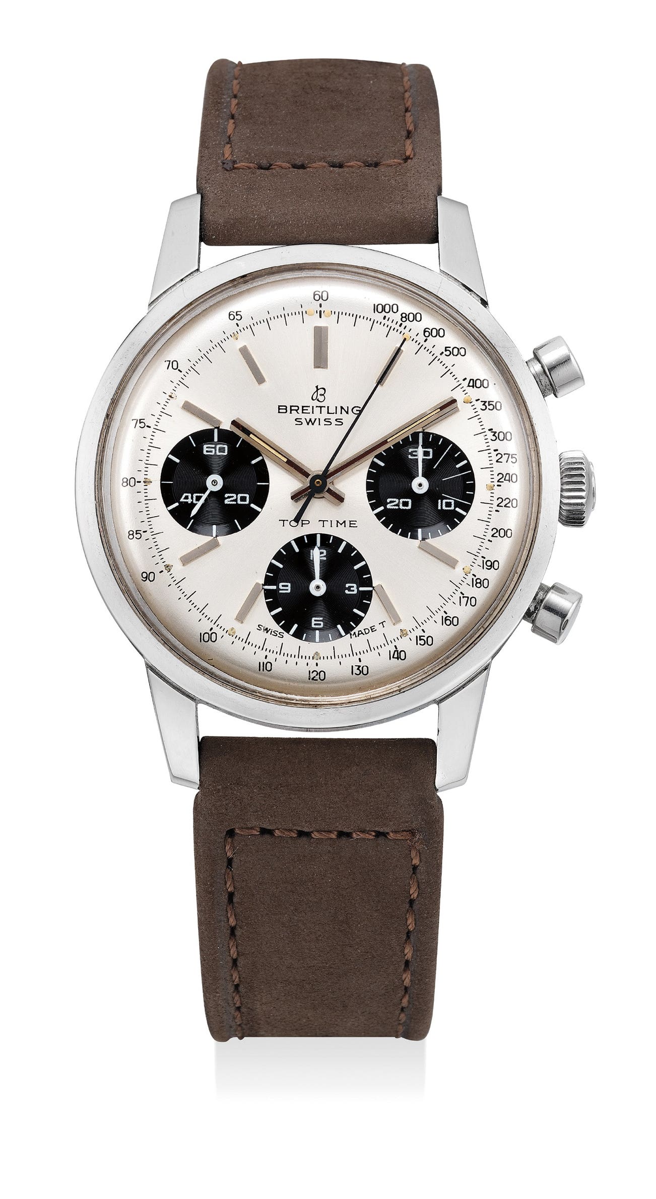 The Top Time line of wristwatches was introduced by Breitling in 1964 to appeal to a younger audience. They were robust timepieces able to withstand active lifestyles, and priced at a much lower point than Breitling’s other chronographs. Over time, they became an icon also thanks to the many celebrities who donned them. Most notably, a Top Time (ref. 2002) is one of only two watches worn by Sean Connery/James Bond (the other being of course the Rolex Submariner) and the first Q-modified timepiece to ever appear in the movie series (specifically, in Thunderbird).