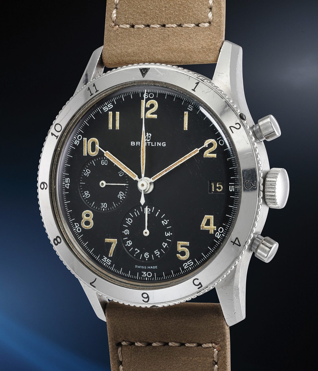 The original dial on this timepiece has developed a warm and delicate patina. Housed in a large 41mm diameter case, this ref. 765, is is one of Breitling's most well-known chronographs, and a contemporary re-edition of the current watch which was re-introduced back in 2020. The present timepiece is a fantastic opportunity for collectors to obtain an excellent professional tool watch made for the French Naval Airforce. It is perfectly sized in today's standards and has a remarkable presence on the wrist.