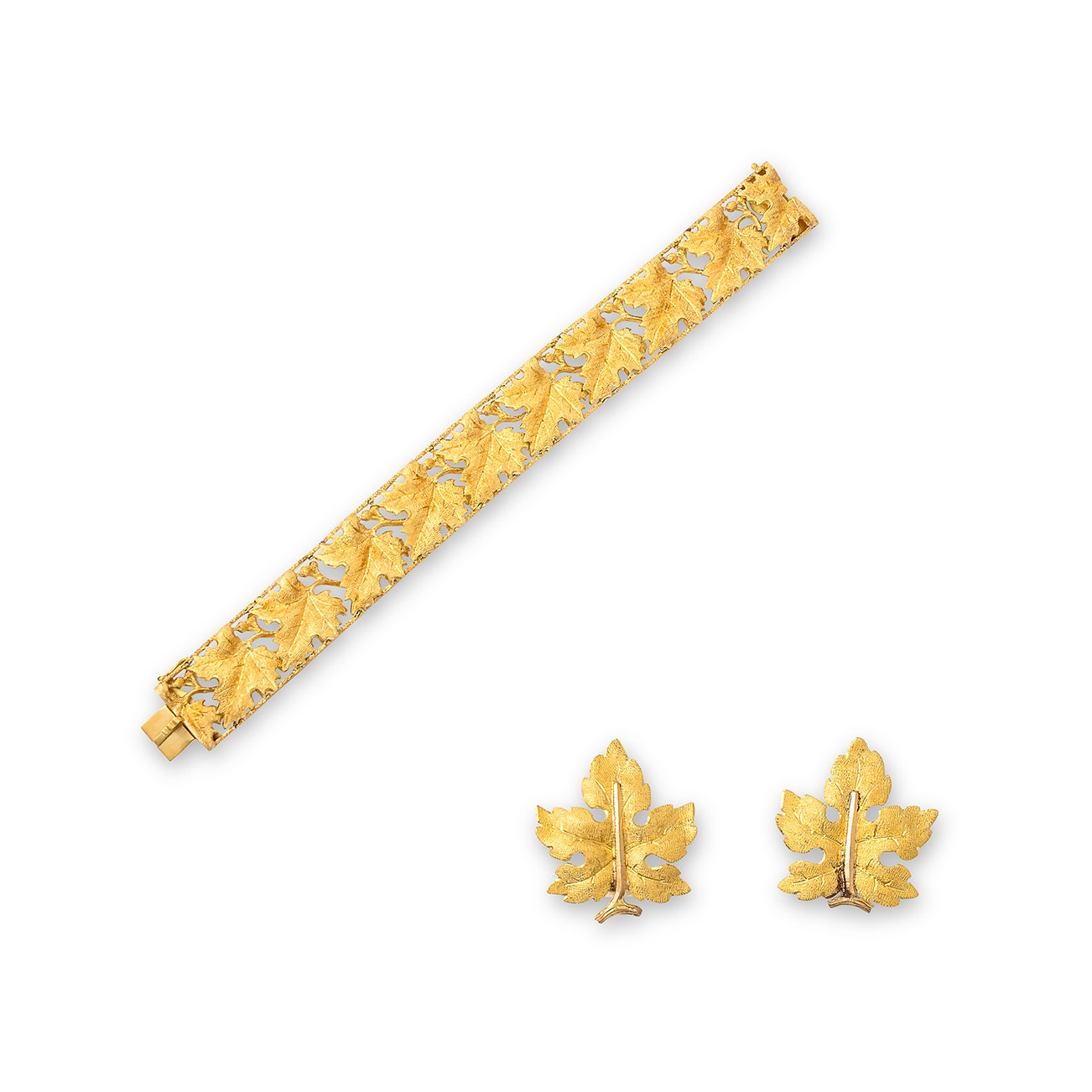 Pair of gold ear clips; together with a bracelet of similar design