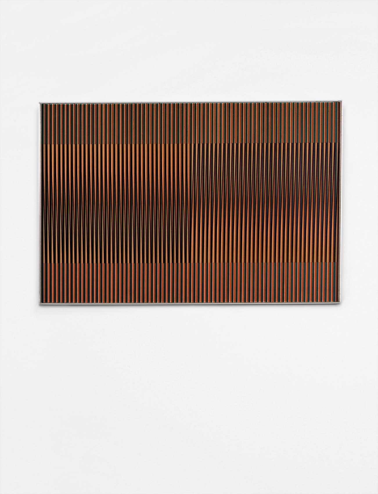 During the 1950s, Carlos Cruz-Diez left Venezuela to travel extensively throughout Europe, where he explored the possibilities of Constructivism while continuing to develop his interest in chromatic structures and color theory. Physichromie No. 939 (1977) is part of his most important series, which he began in 1959 and has continued to investigate for decades. The exact medium of these works has developed over time but has always consisted of alternating colored strips that trap light, producing a chromatic effect that constantly changes as the viewer moves around the piece. In this way, the viewer becomes a participant in the artwork, not merely a spectator. The innovative aspects of the these works immediately caught the attention of the international milieu, and very early in his career Cruz-Diez was included in two seminal exhibitions in Europe and the United States: Movement 2 at the famous Galerie Denise René in Paris in 1964 and The Responsive Eye at the Museum of Modern Art in New York in 1965. Cruz-Diez was also the subject of a major retrospective at the Museum of Fine Arts Houston in 2011, titled Carlos Cruz-Diez: Color in Space and Time.