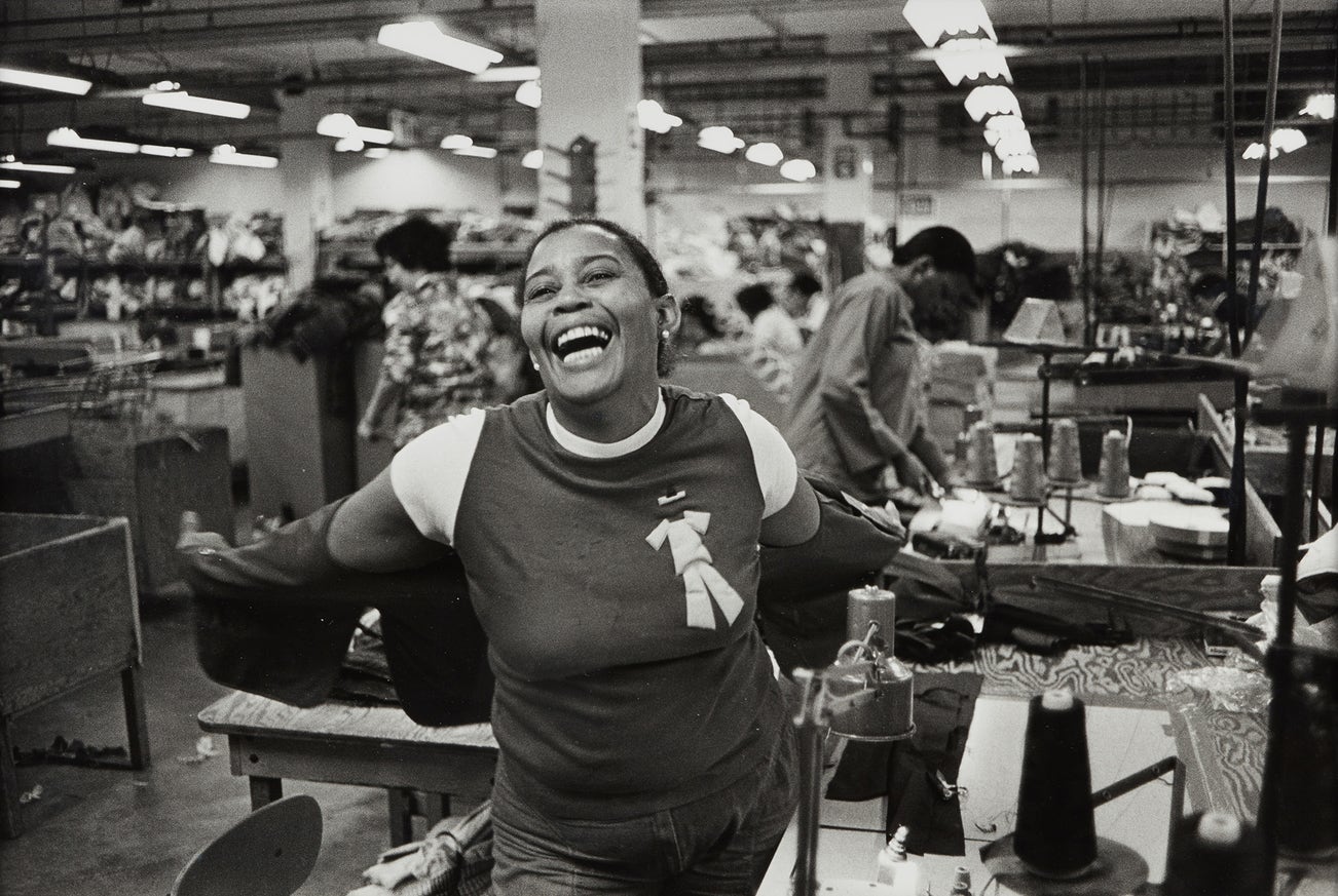 While working towards her BFA from the California Institute of Art in the late 1970s and early 1980s, Carrie Mae Weems began taking documentary-style photographs of her extended family. The images, which would became Family Pictures and Stories -- her first comprehensive body of work – depicted the realities of their lives: moments of hardships and joy in equal measure. In Mom at Work, Weems captured her mother, Carrie Polke, in a moment of laughter while at her factory job. Other images in the series show her seated on her father’s lap and a large family reunion, a collective portrait which poignantly contested the narrative of the fractured Black family.