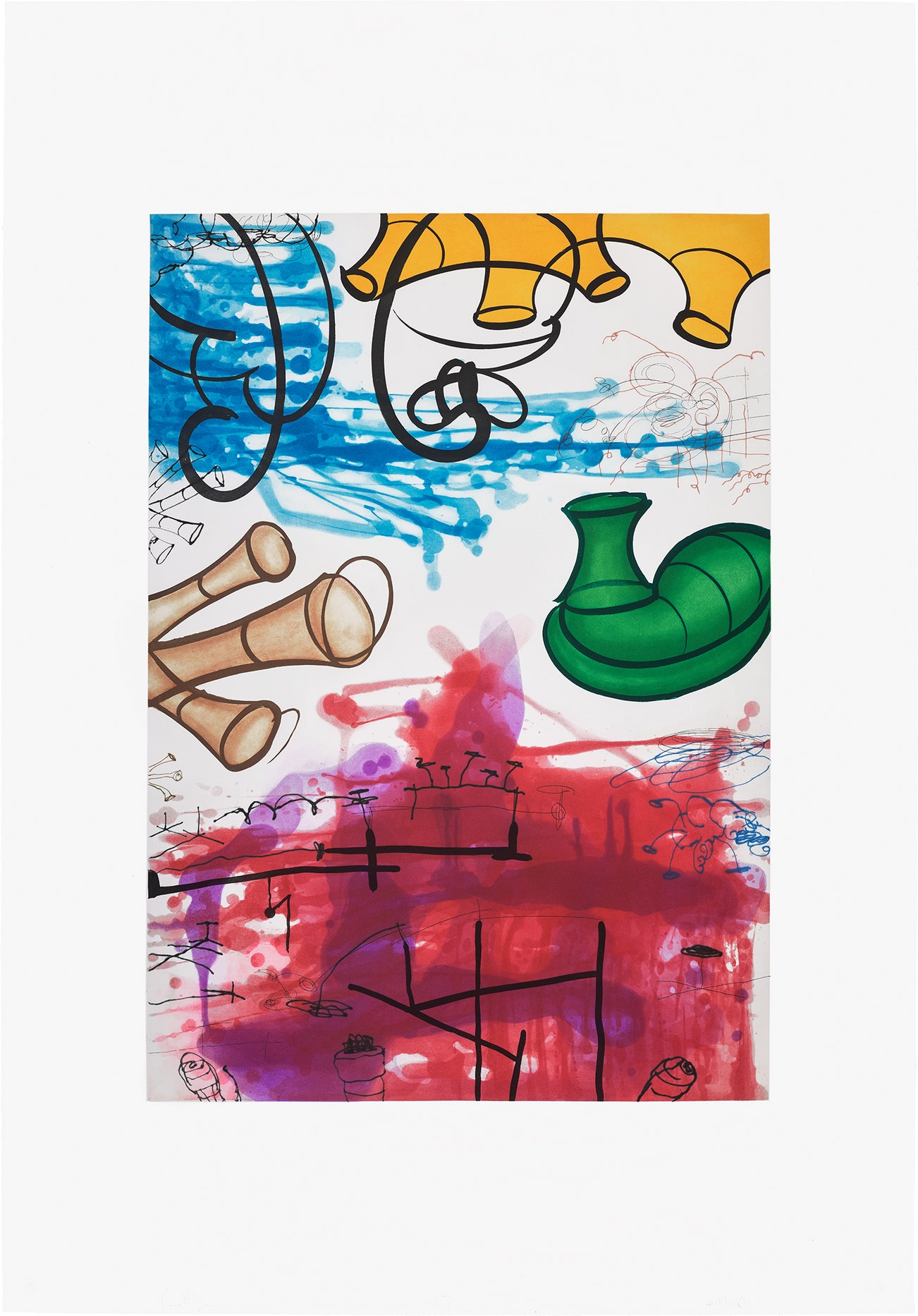 American | 1949Satire and sexuality meet Carroll Dunham's vivid brush in the artist's often large-scale fantasy worlds. His eye-popping cartoonish veneer takes a cue from Philip Guston while his primitive "visual language" of faceless figures continues a long line of tradition—think back to Paul Cézanne and Pierre-Auguste Renoir.