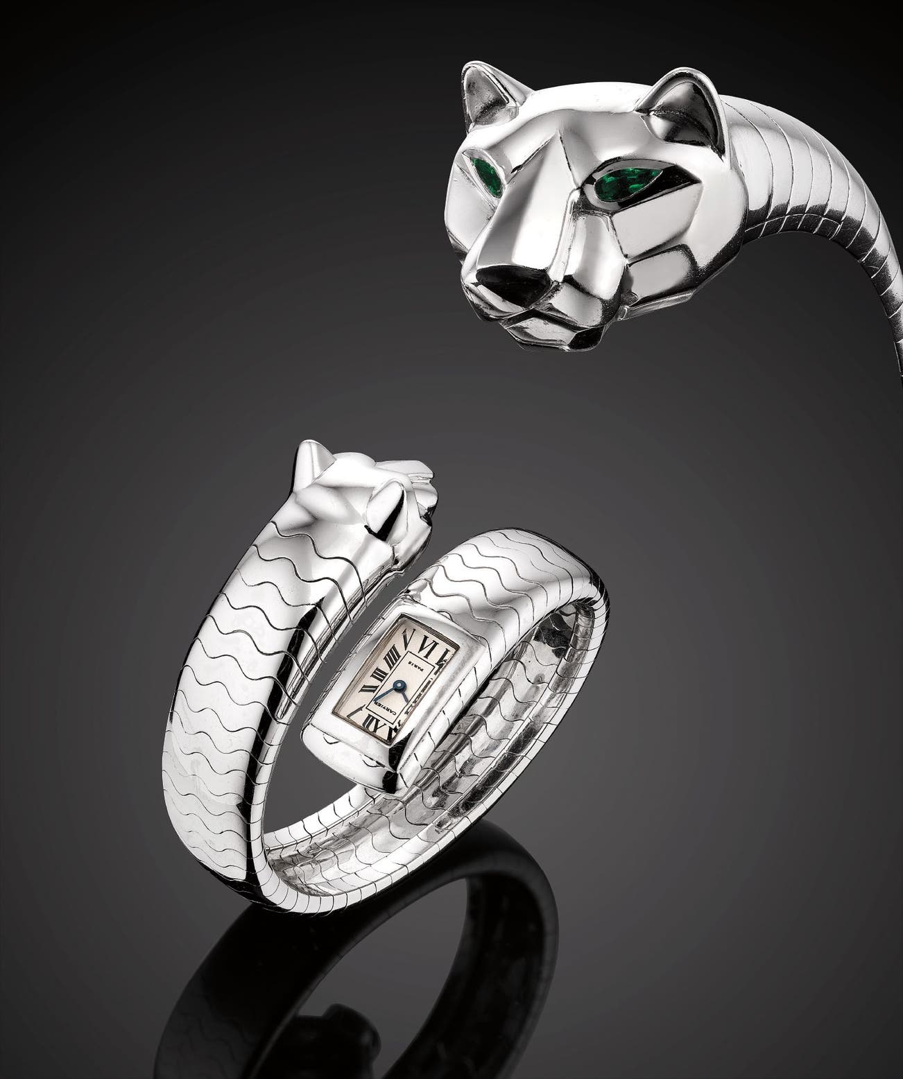 卡地亞,精細及罕有,18K白金鑲綠寶石手鐲,配石英時計,“Panthere”,約1995年製