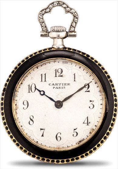 卡地亞,非常精細及罕有,雙色金及琺瑯鑲鑽石吊咀,配時計及蒂芙尼18K白金鑲鑽石項鍊,1912年製