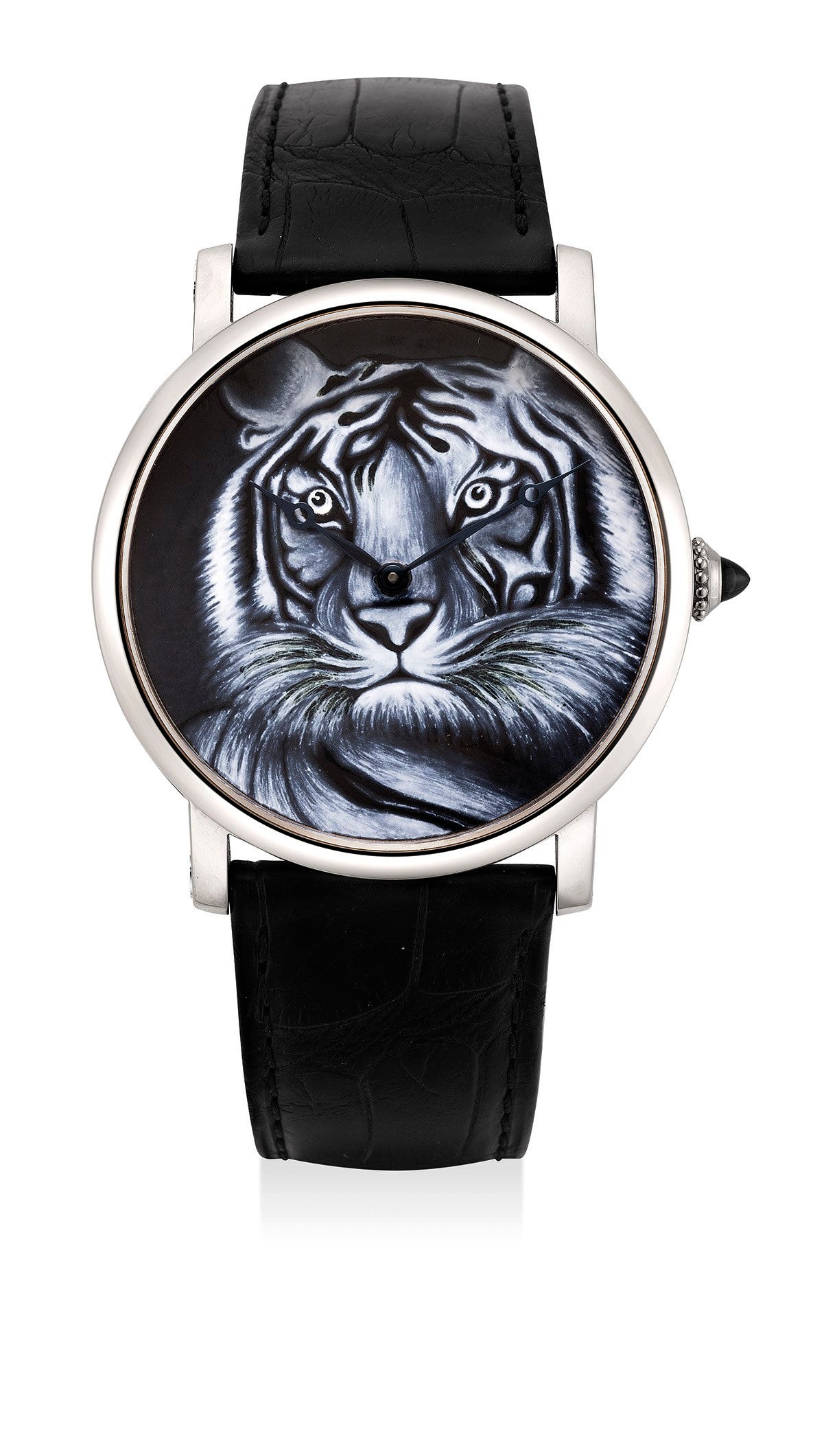 卡地亞,精細及十分罕有,限量版18K白金腕錶,配老虎圖案灰調琺瑯錶盤,限量發行100枚,編號第7號,約2012年製。附錶盒和證書