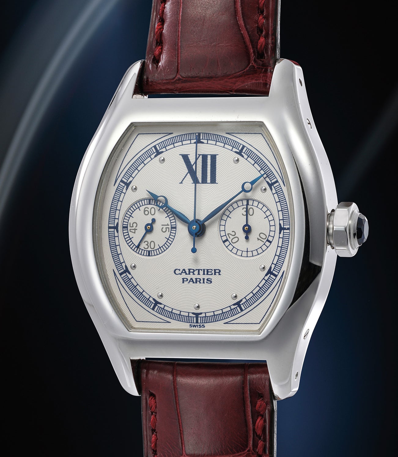 The first monopoussoir, or monopusher, chronograph was released by Cartier in 1928 and the modern edition remains close to the original, but with a larger, more contemporary case featuring the manual caliber 045MC, interestingly co-developed by F. P. Journe, Denis Flageollet and Vianney Halter. The case has a classic look with the single button chronograph operated through the crown giving the watch a clean, uncluttered appeal.