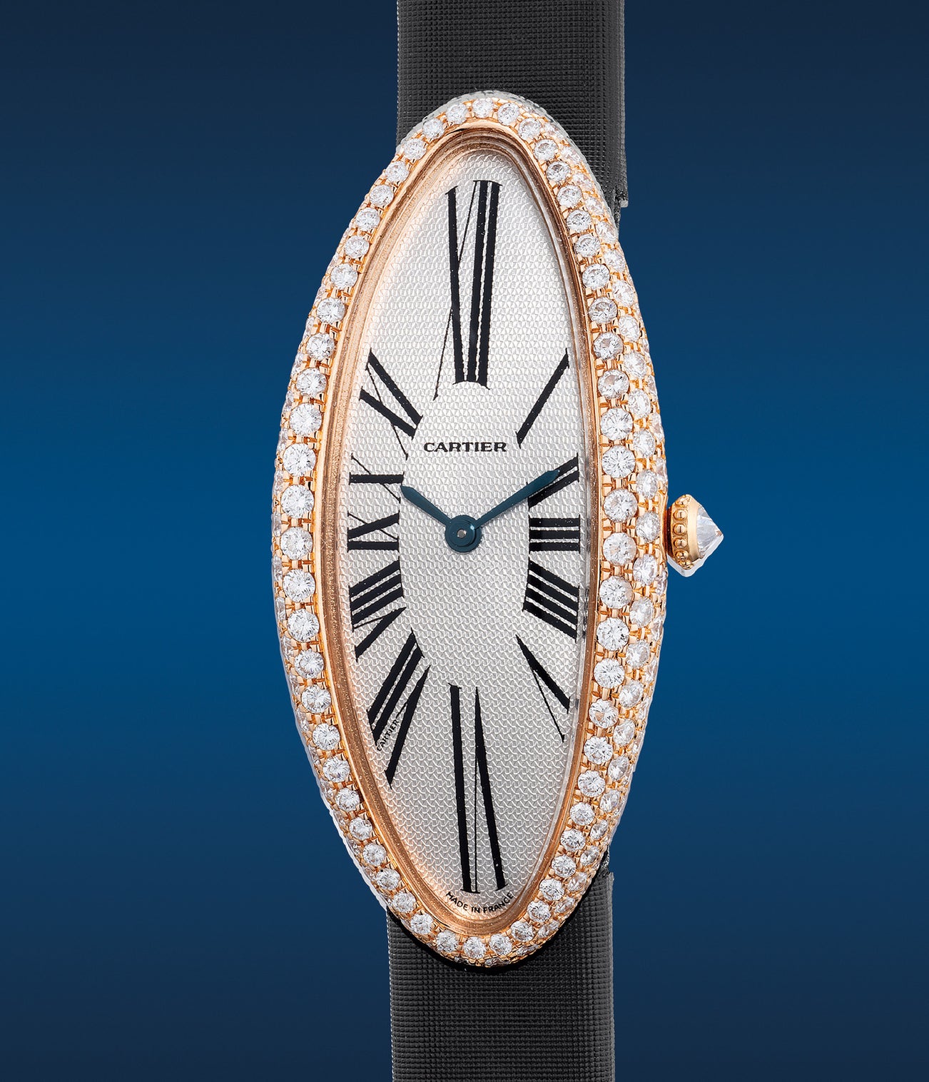 Faithful to its original design, the present pink gold variant of the Baignore Allongée from circa 2000s is dressed with glamour and elegance of Parisian chic. Adorned with diamonds in contrast with the ivory hued guilloché dial, the sword hands are finished in blued steel which adds a nice touch of colour to its lavish appeal. Although it measures with a dramatic 47mm by 21mm case, its curved shape wraps around the wrist with incredible comfort. Featuring the classic Roman numerals and secret signature and 7 o’clock and preserved in a stunning condition, the present example is a timepiece of elegance and class.