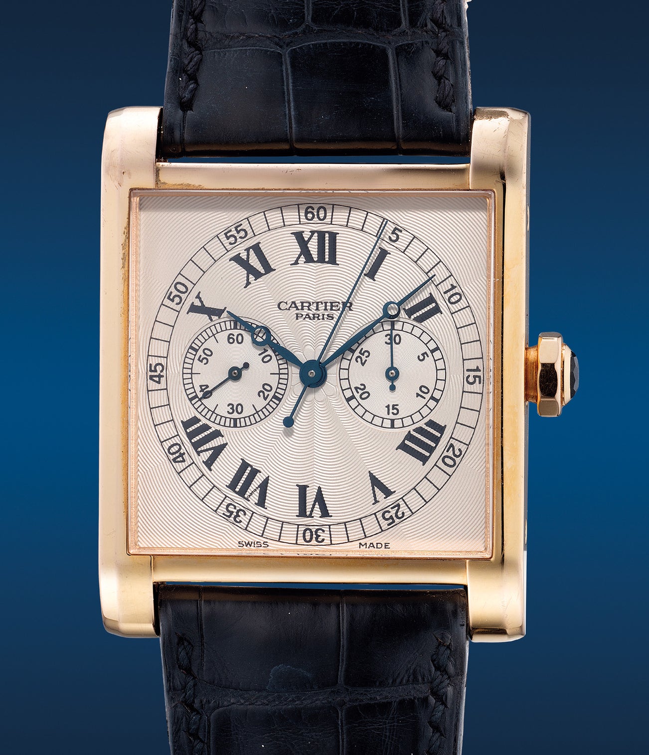 Confirmed by the engraving on the caseback of the watch, only 100 pieces of the Tank Monopoussoir were encased in pink gold. Furthermore, the watch is in excellent overall condition with its original accessories.