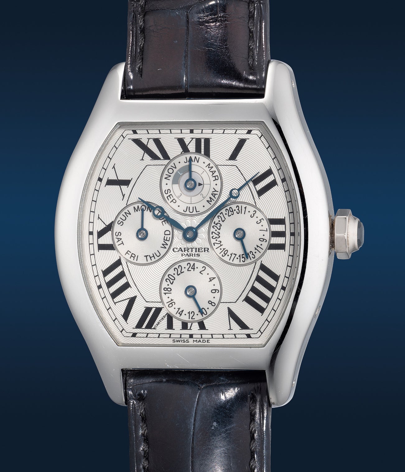 Fitted with the house’s distinctive Tortue case, the present ref. 2721 is an exquisitely designed perpetual calendar with a dual time display. It is also cased in platinum with the self-winding cal. 9421MC, combining sophistication with practicality. The details of the dial are subtle and beautifully proportioned, with the four sub-registers contrasted against the guilloche pattern, black Roman numerals, and Breguet-style hands in blue steel. In the center sits a small rosette inspired by vintage Cartier clocks. Signed “Cartier Paris” at 12 o’clock, the timepiece is truly a homage to early 20th century watchmaking.