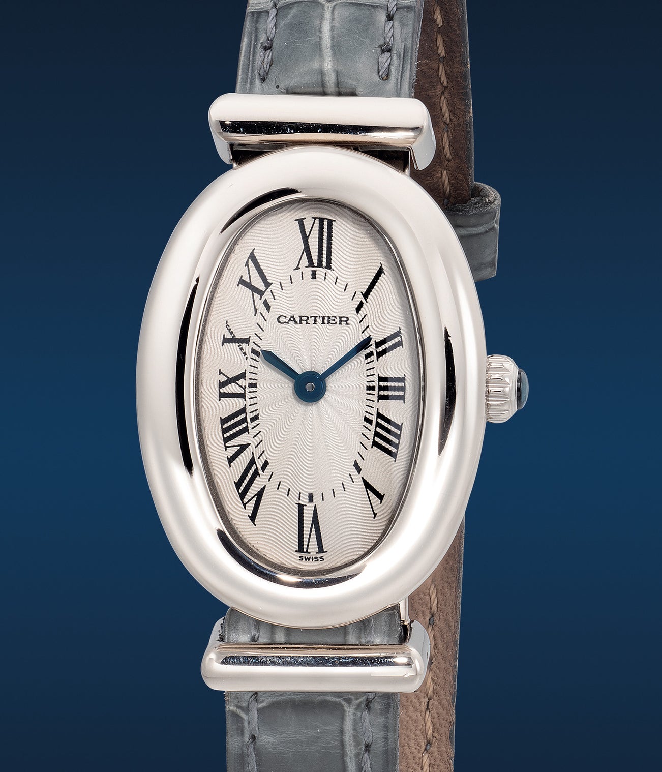 A quintessential Cartier creation, the present white gold timepiece flaunts a classic guilloche dial with an ivory background and contrasting black Roman numerals. Of course, the blued steel hands match the sapphire cabochon that tops the crown. Offered at PHILLIPS for the first time, this example is exceptionally well-preserved and is further accompanied by its original accessories. Designed to turn heads, this quartz-driven Baignoire from the Bi Plan Louis Cartier collection is certainly destined to grace the wrists of connoisseurs seeking a classic yet quirky that outshines the ordinary.
