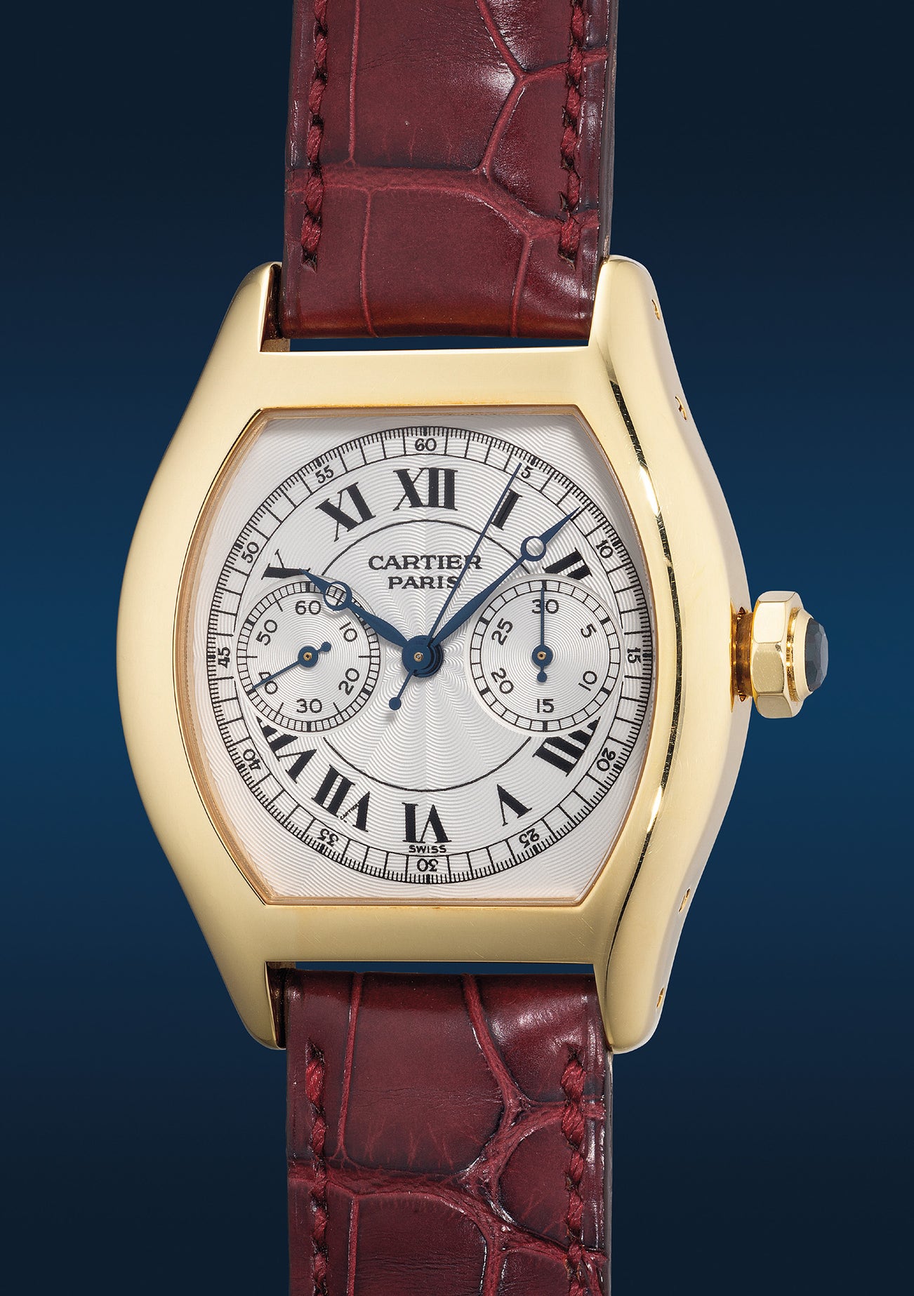 This Cartier Tortue Monopoussoir is fitted with a classic guilloché dial including a Cartier Paris signature at 12 o’clock, black roman numerals, and blued steel hands, warmed by a 34x44mm 18k yellow gold case. The chronograph is operated solely by a single pusher on its crown that is all-encompassing in the start, stop, and reset functions. The caseback has been engraved with No. 0100. This watch has been made available using three different metals including this yellow gold version, as well as white gold (Lot 966 in this auction) and pink gold.