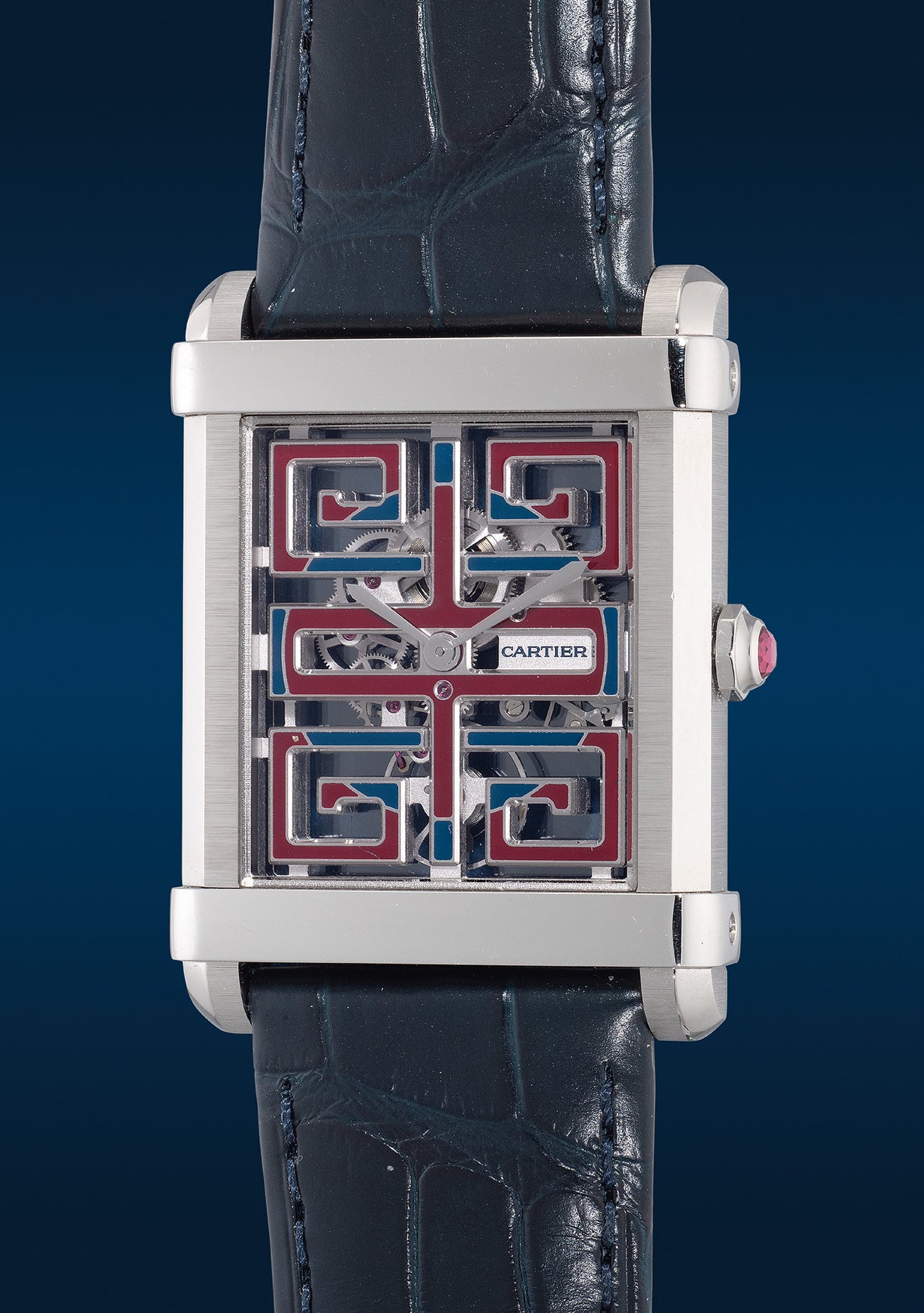 Upon first glance, one is captivated by the skeletonized dial and vibrant color combination. Interestingly, instead of Roman numerals, which are often associated with Cartier's skeleton movements, the bridges and base plate of this watch have been openworked to form a Chinese architectural inspired pattern that complements the overall case construction. The use of cobalt blue and burgundy lacquer colors creates a yin and yang image of a circle within a square that signifies balance and harmony.