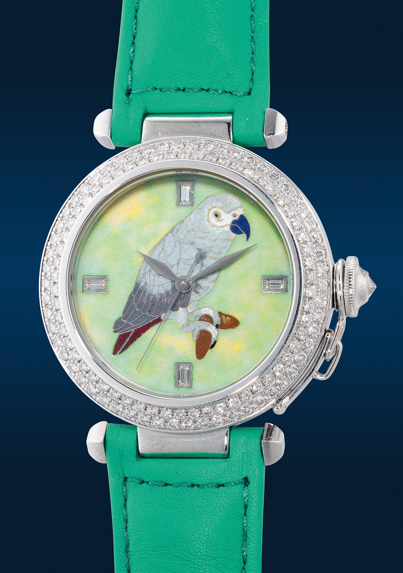 卡地亞,「Collection Privée, Pasha de Cartier」型號2495,精細罕有,限量版白金鑲鑽自動腕錶,備剛果灰鸚鵡掐絲琺瑯鑲鑽錶盤、中心秒針,約2000年代製