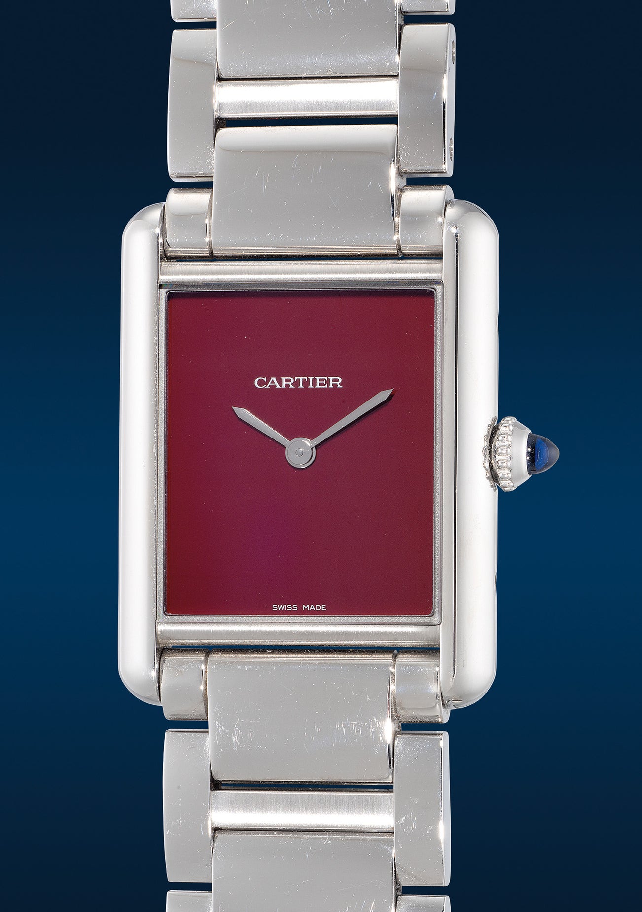 The present example in famous burgundy red of Cartier is further paired with a Cartier Tank bracelet, giving it a sportier appeal to the classic design.