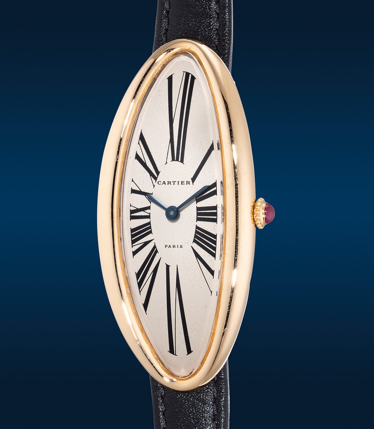 卡地亞,「Baignoire Allongée “Maxi Oval”」型號,罕有精細,玫瑰金腕錶,備黑色羅馬數字錶盤、紅寶石錶冠,約1980年代製 — 目前唯一僅知