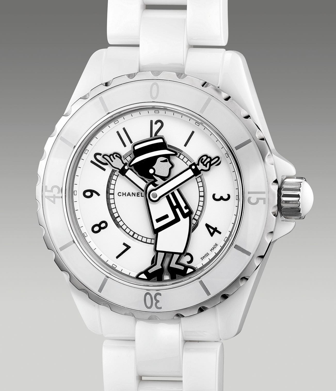 To commemorate 17 years of J12, Chanel launched a couple of limited edition of 555 pieces for each white and black ceramic. An instant hit, the dial depicts Mrs. Coco Chanel in cartoon form with articulated hands telling the time. The present example in white ceramic is presented in excellent overall condition and is complete with the full set of accessories.