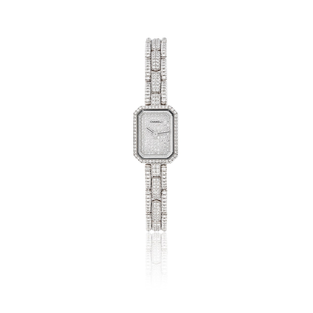 Of quartz movement, brilliant-cut diamond-set dial, sword-shaped hands, bezel and bracelet set with brilliant-cut diamonds, diameter approximately 15mm, length approximately 178mm, dial, caseback and clasp signed Chanel, caseback numbered, maker's mark for Chanel, Swiss hallmark for gold, screwdriver and pouch stamped Chanel.
