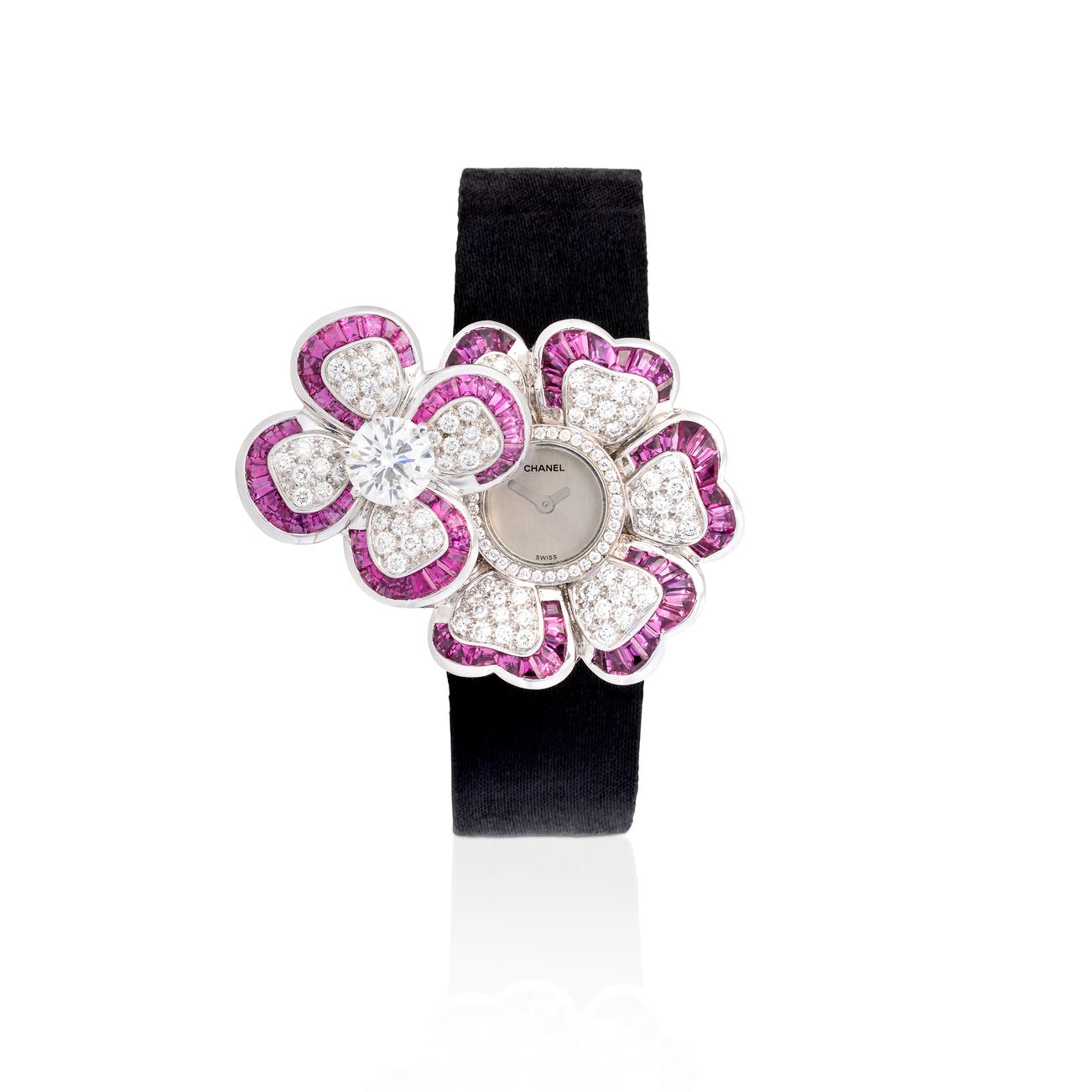 The case modelled as a flower, the pistil set with a brilliant-cut diamond weighing 1.59 carats, the petals decorated with calibré-cut rubies and brilliant-cut diamonds, opening to reveal a watch of quartz movement with a silver dial, the black silk-satin strap completed with a folding clasp, case width approximately 38mm, inner circumference approximately 160mm, dial, exterior caseback, clasp and strap signed Chanel, exterior caseback and clasp numbered, French maker's mark and assay marks for gold, Swiss hallmarks for gold.