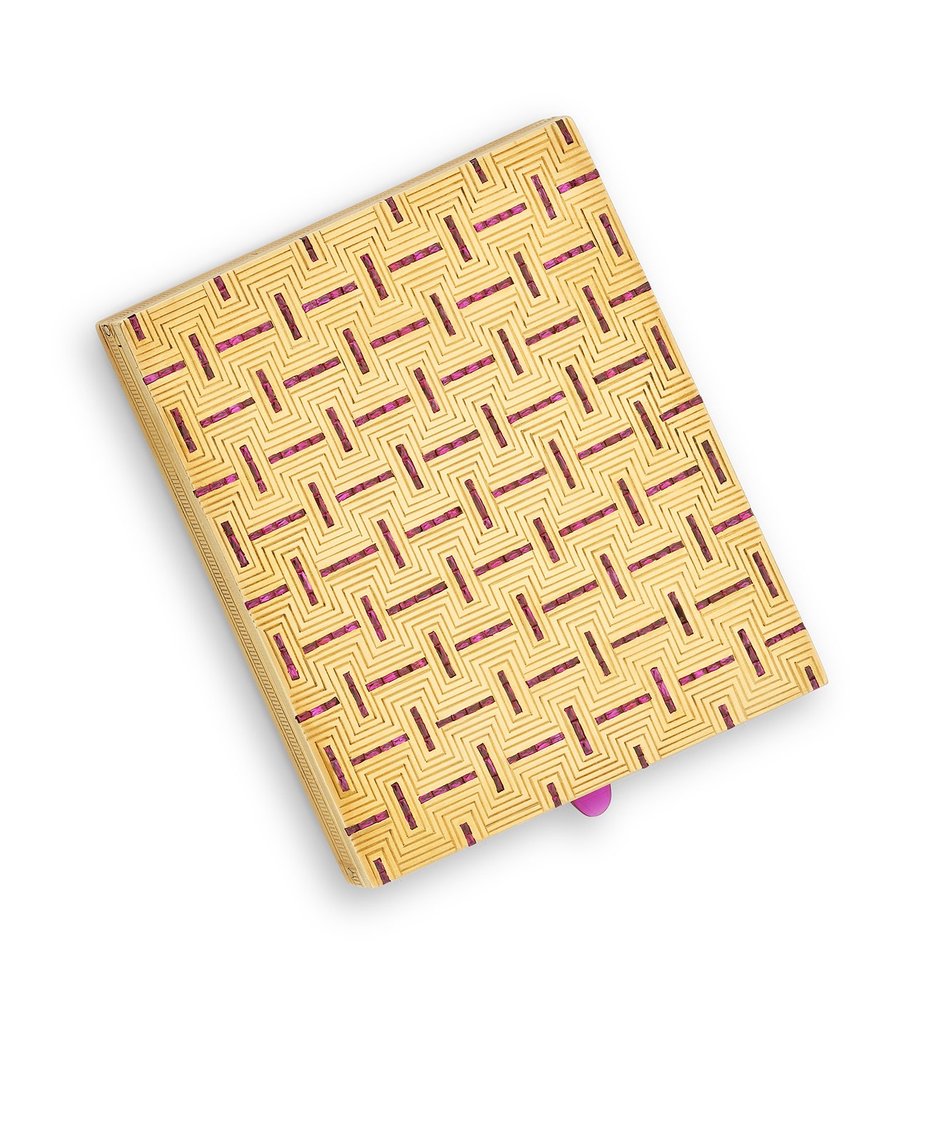 The carved gold cover embellished with calibré-cut rubies set in geometric motifs, the, thumbpiece set with a polished ruby, measuring approximately 91 x 73mm, numbered, French maker's mark for Charles Holl and assay mark for gold, a few small rubies deficient.