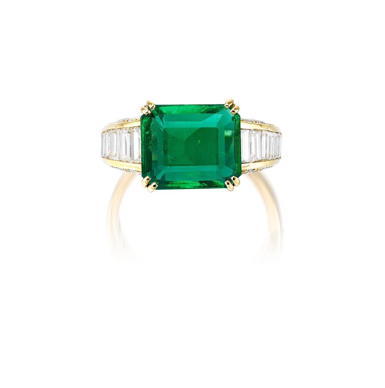 Set with a step-cut emerald, between baguette and brilliant-cut diamond shoulders, mounted in gold, size 7¾, signed Chaumet.
