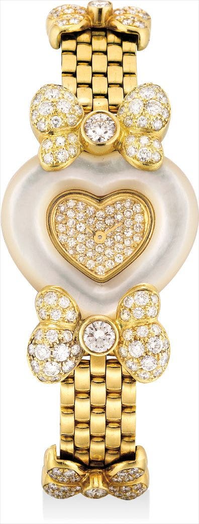 蕭邦,精細,18K黃金鑲鑽石,女裝心形石英鏈帶腕錶,配貝母錶圈,型號538 1,約1995年製