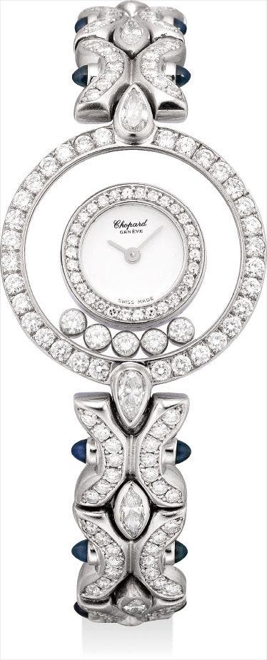 蕭邦,精細及罕有,18K白金鑲鑽石及藍寶石,女裝石英鏈帶腕錶,“Happy Diamonds”,型號20/5453,附證書及盒子,由Wempe銷售,約1995年製