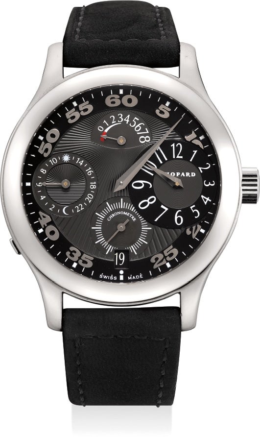 蕭邦,精細及獨一無二,鈀金屬腕錶,配24小時動力儲存和三針一線錶盤,2005年特為慈善拍賣Only Watch製作。附原裝錶盒、證書、放大鏡和使用說明書