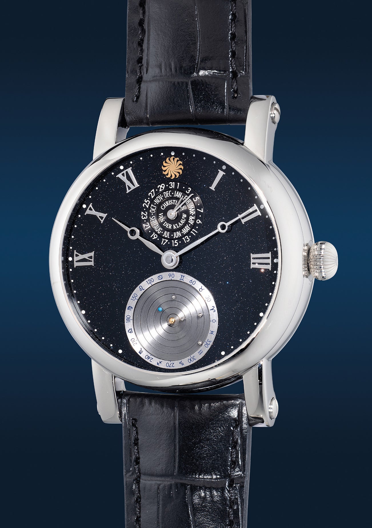 In 1992, he won the award for the most innovative movement design for his Pendule Variable in Basel, Switzerland. Continue his expertise and passion for astrology, Christiaan van der Klaaw debuted his first wristwatch, the CVDK Staellite du Monde in 1994. A that showed the time, day and date, as well as the moon phase, day and night indicator and the place on earth where it is exactly noon at the time you are looking at your watch. In 1999, he created the present masterpiece CVDK Planetarium: the smallest mechanical Planetarium in the world that pays homage to Dutch grandmaster astronomers including Christiaan Huygens, Eise Eisinga.