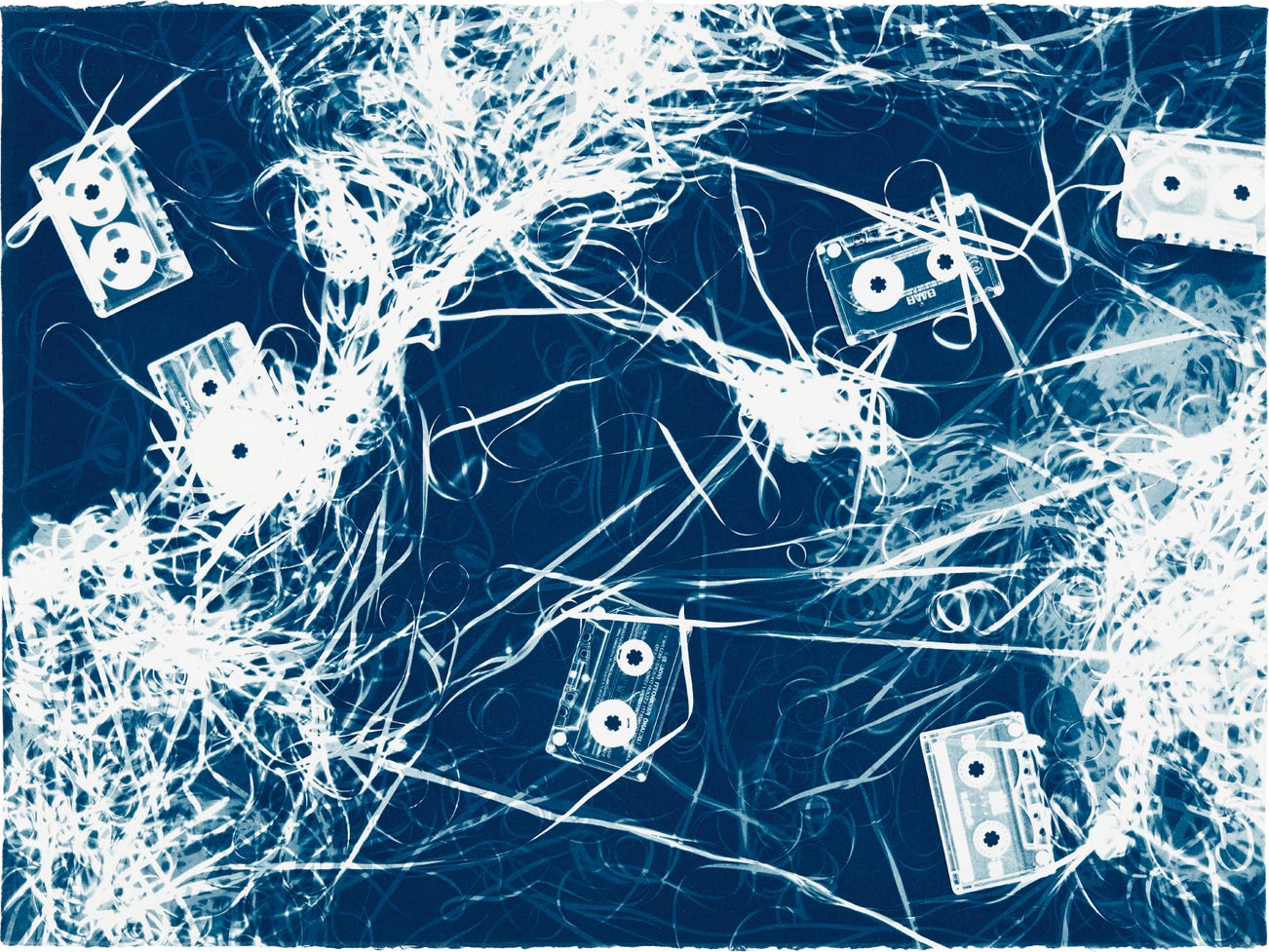Although the cyanotype series was produced between 2007-2009 in collaboration with Graphicstudio, Marclay’s images are well-informed by artists and movements of the past. The silhouettes of audio cassettes and their unfurling tape honor one of the earliest photographic techniques, while connecting with the exploration of early avant-garde photograms by Man Ray (lot 301) and Moholy-Nagy. The movement inherent in the composition additionally harkens back to the great Abstract Expressionist painters such as Jackson Pollock. Marclay’s selection of subject matter, cassette tapes found in thrift shops around Tampa, Florida, elevates this largely obsolete recording method through an equally outmoded photographic process. His varied cassette configurations formed by commingling the long spools of both renowned artists such as Luciano Pavarotti, R.E.M., Barbara Streisand, Rod Stewart, and Madonna’s music with swaths of nameless generic mixed tapes give a universal leveling in their new representation. His ingenious pairing of subject matter and process along with his descriptive titles form a conceptually rich and dynamic series--all of which is present in the work on offer. The precision in execution of capturing the swirling tape through the expansive spectrum of shades of Prussian-blue create an opus full of sound and light. Marclay’s modern cyanotype of six cassette tapes unspooled here have transcended their original form into a piercing blue masterwork.