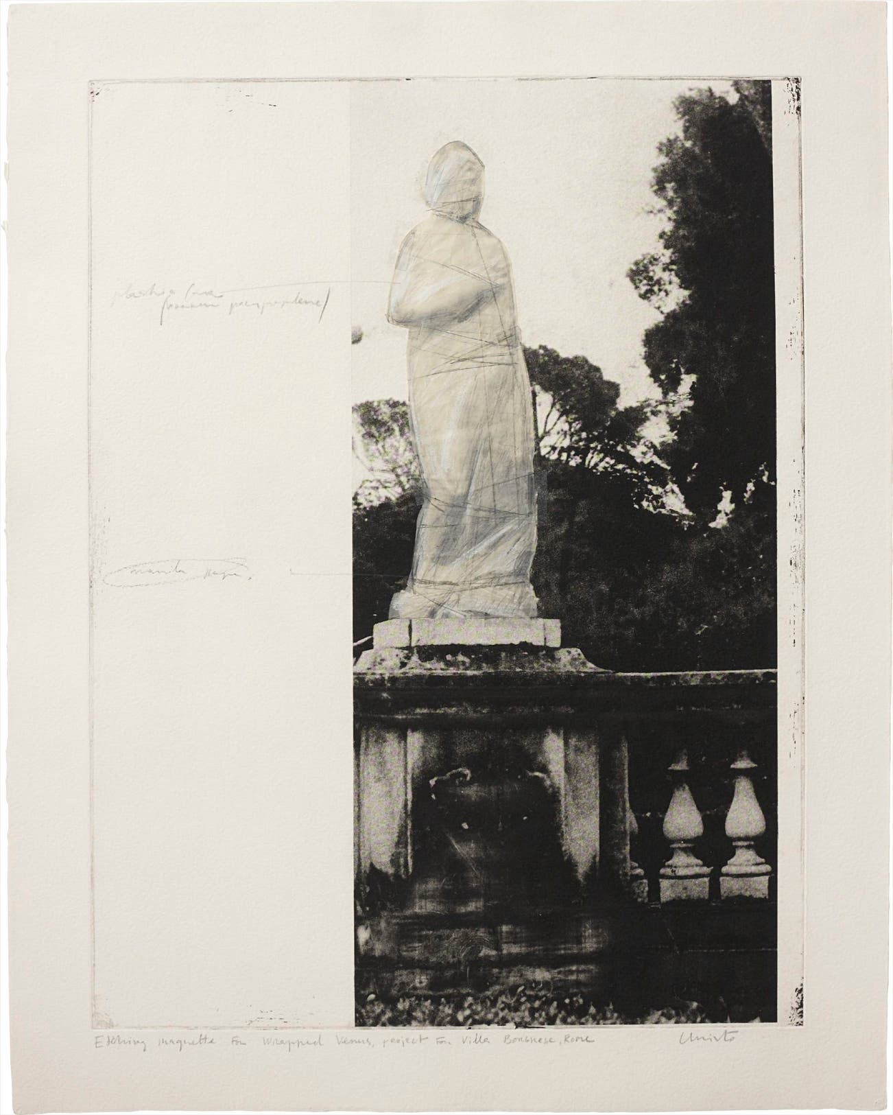 Signed ‘Christo’ lower right, titled ‘Etching Maquette for Wrapped Venus, project for Villa Borghese, Rome’ lower left. This work is accompanied by a certificate of authenticity issued by Landfall Press, Inc.