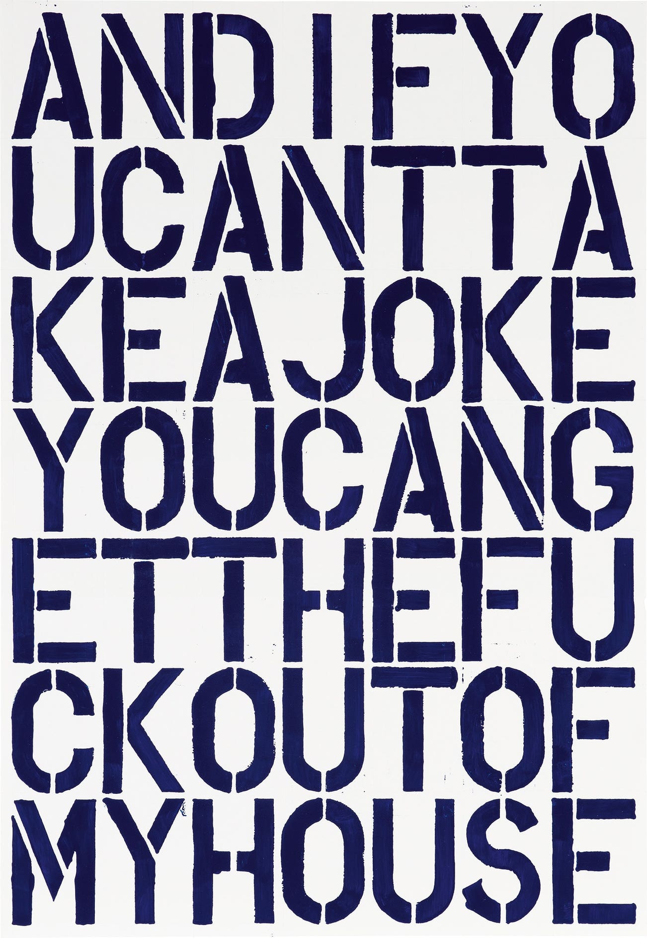 In the present work, Wool has broken up the letters and spaces that constitute the phrase AND IF YOU CANT TAKE A JOKE YOU CAN GET THE FUCK OUT OF MY HOUSE into a grid that is divorced from linguistic comprehension, compelling the viewer to actively engage with the work. By isolating the text, Wool lends focus to the letters as purely visual elements. Seemingly ready to burst out of the compositional frame, the letters that make up this profane declaration highlight the work’s physical parameters, giving the words a sense of emergence from the background and assaulting the viewer with their insistence.